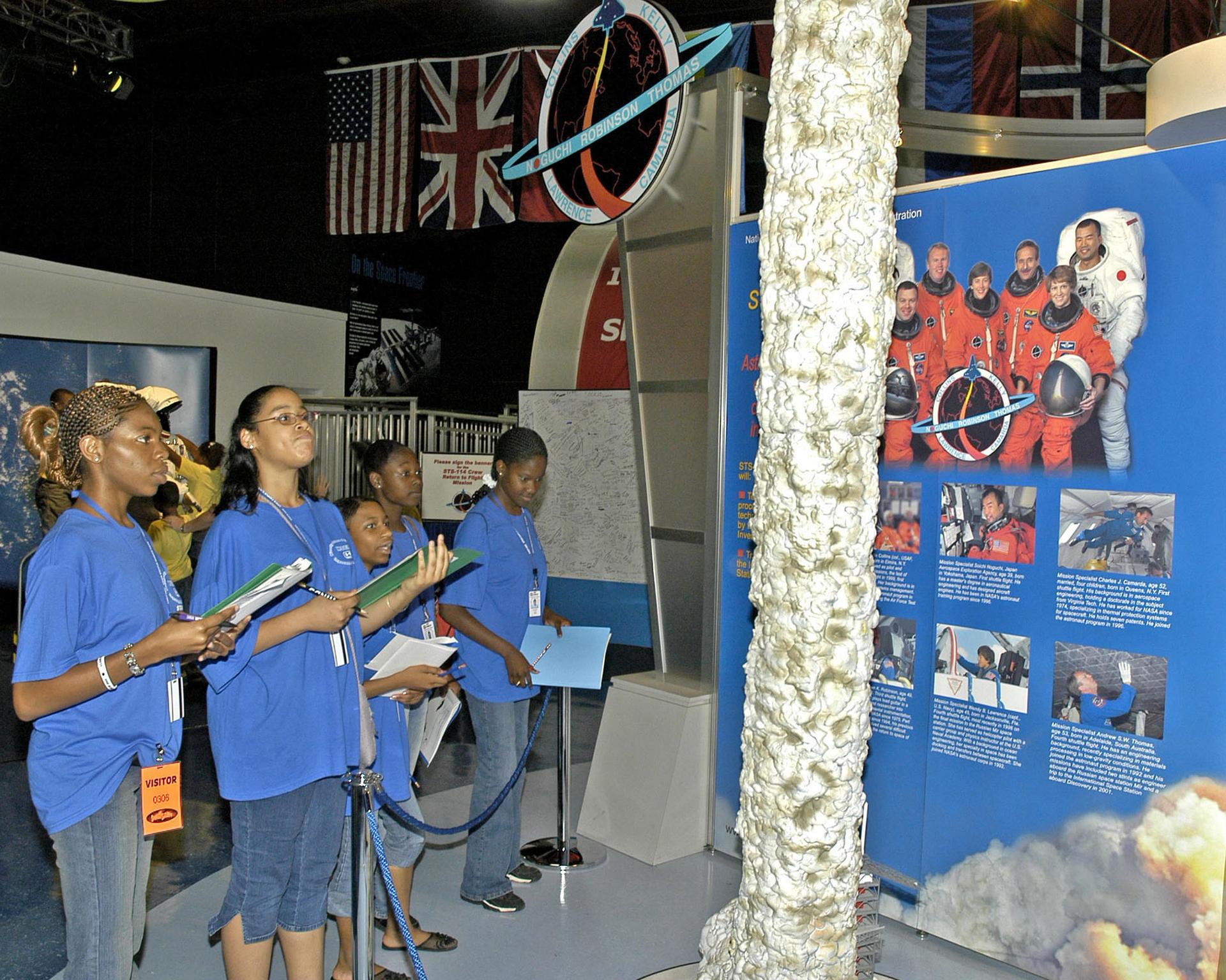 Student Assistant Antoinette Davis (left) of Utica; Carmella Forsythe, 13, of Clinton; Terri Henderson, 14, of Clinton; Tyra Greer, 12, of Port Gibson; and Kala Battle, 14, of Edwards, answer curriculum questions about NASA's Return to Flight mission exhibit at StenniSphere, the visitor center at NASA's Stennis Space Center (SSC) near Bay St. Louis, Miss. The girls were on a field trip to StenniSphere with fellow participants in Hinds Community College's MSEIP (Minority Science Engineering Improvement Program) summer program. MSEIP encourages students to pursue and prepare for careers in science, technology, engineering and math.
