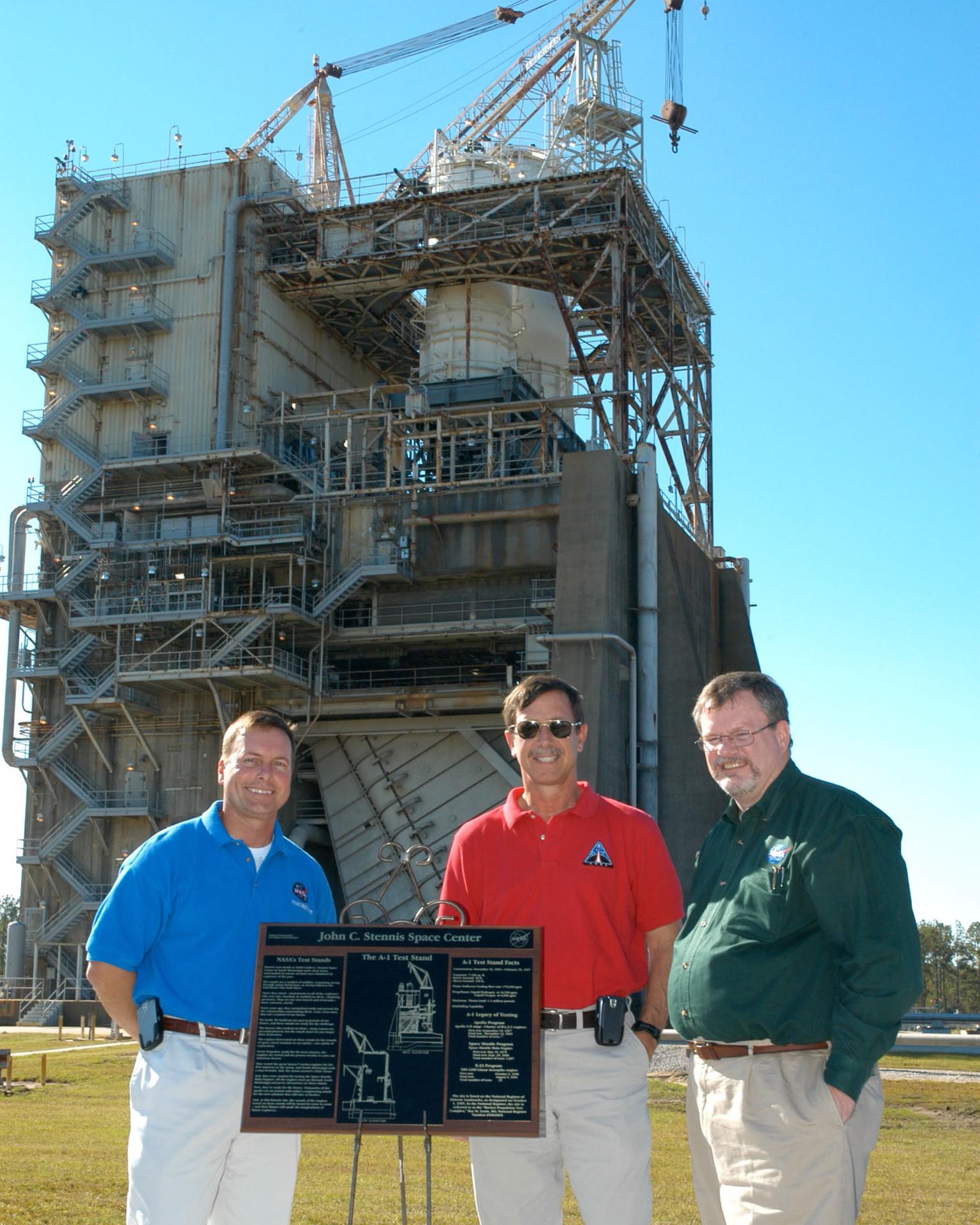 The A-1 Test Stand at NASA Stennis Space Center near Bay St. Louis, Miss., was the focus of a ceremony held Thursday to transition the storied facility to a new program of work: testing the J-2X engines that will power the agency's next generation spacecraft, Ares I & V. Standing before the historic structure, with a plaque commemorating the change, are (from left) SSC Center Director Richard Gilbrech; NASA Associate Administrator for Exploration Systems Scott Horowitz; and NASA Space Operations Deputy Associate Administrator for Program Integration Michael Hawes. Ares vehicles are the crew and cargo launch vehicles being developed under NASA's Constellation Program.