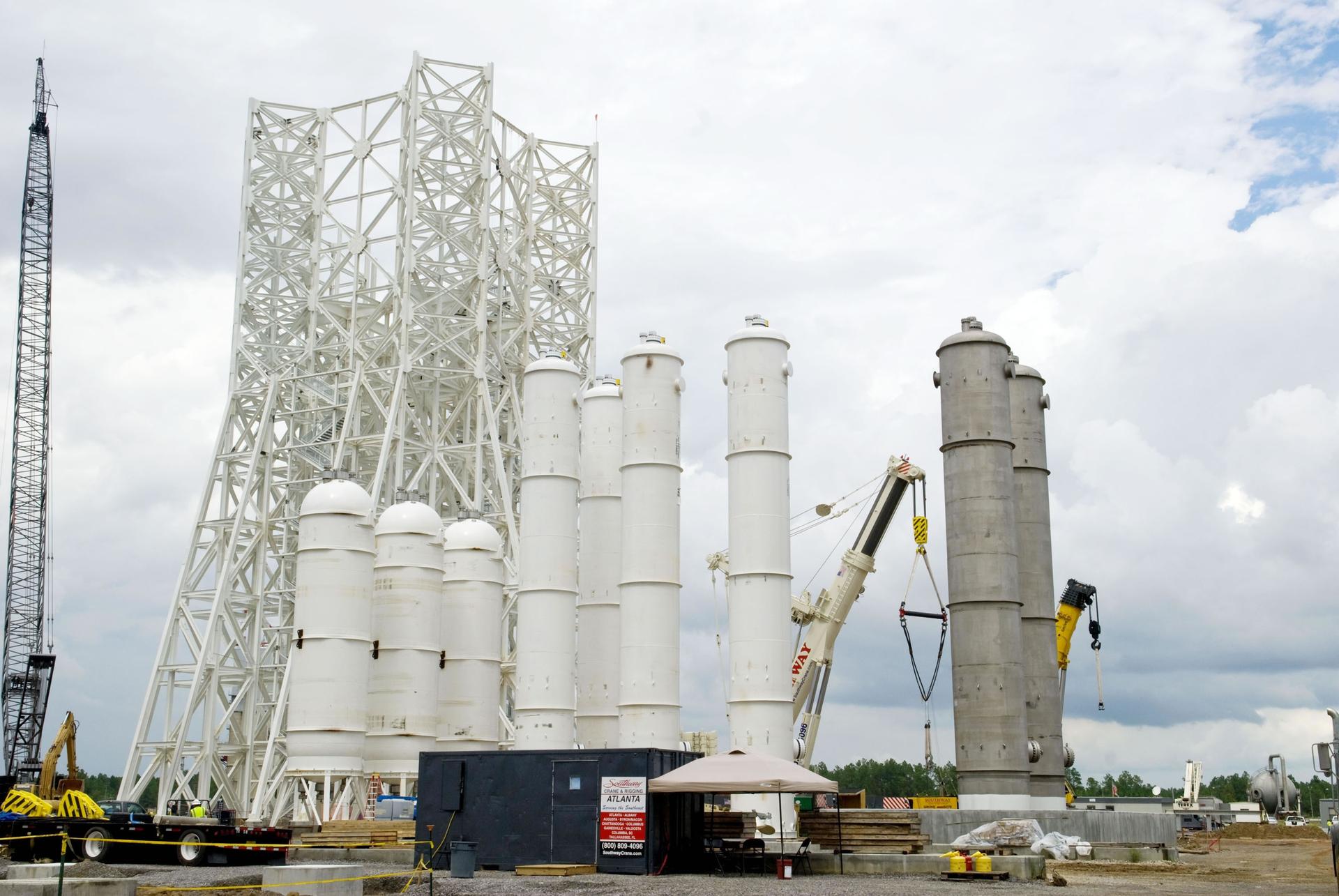 Construction of the A-3 Test Stand approaches another milestone with delivery and installation of water, isopropyl alcohol (IPA) and liquid oxygen (LOX) tanks. The three LOX tanks shown on the left and the two IPA tanks shown on the right are all 35,000 gallons each. The four water tanks in the center are 39,000 gallons each.