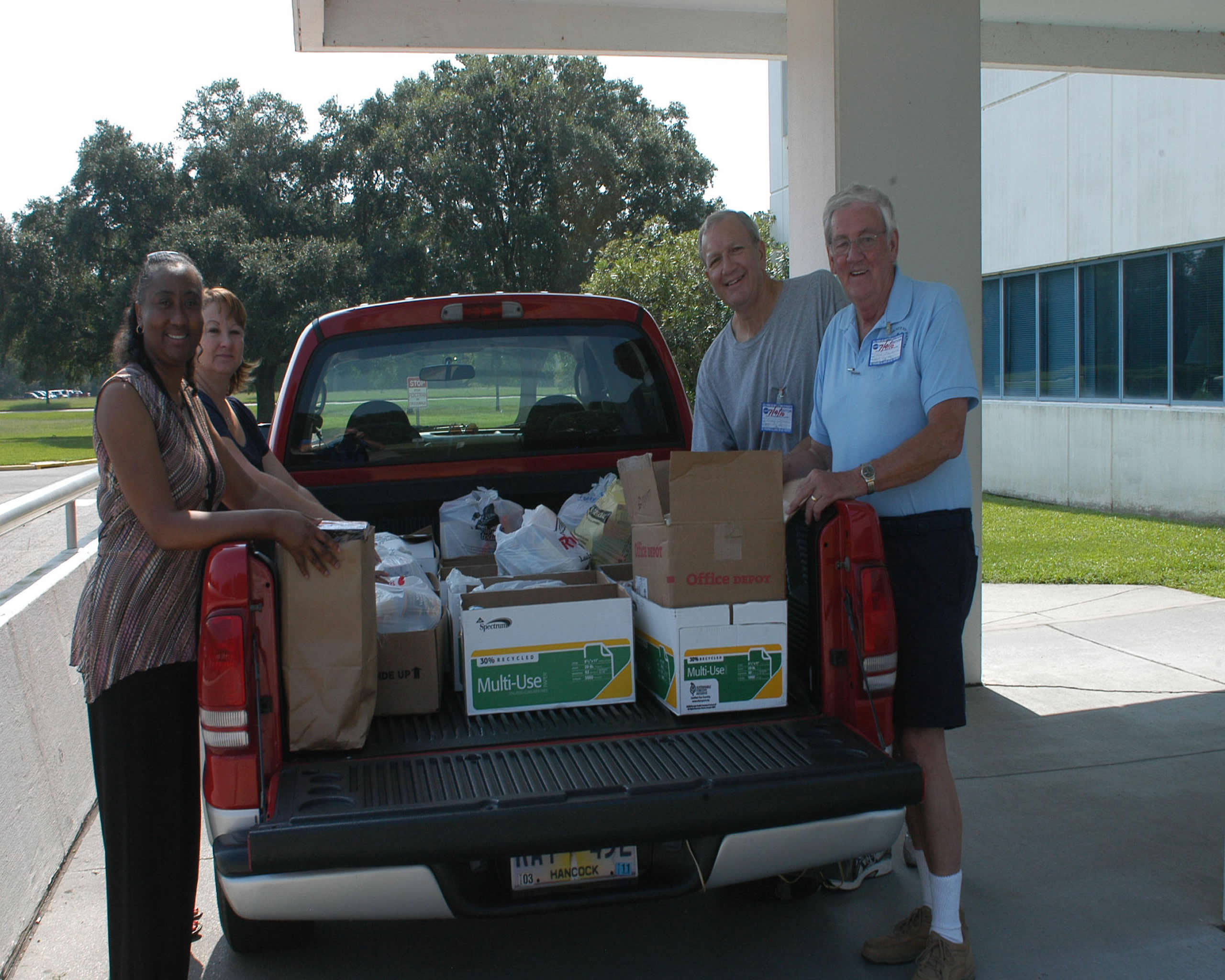 Cabrina Bell (l to r) and Jeanie Frederick with the Stennis Space Center Office of Human Capital help Hancock County Food Pantry representatives Edward Catone and Frank Manchester load collected food items July 9 as part of the 2010 Feds Feed Families campaign. The second annual national food drive was launched last month and involves federal agencies and employees across the country. Organizers hope to collect 1.2 million pounds of food items throughout the summer.