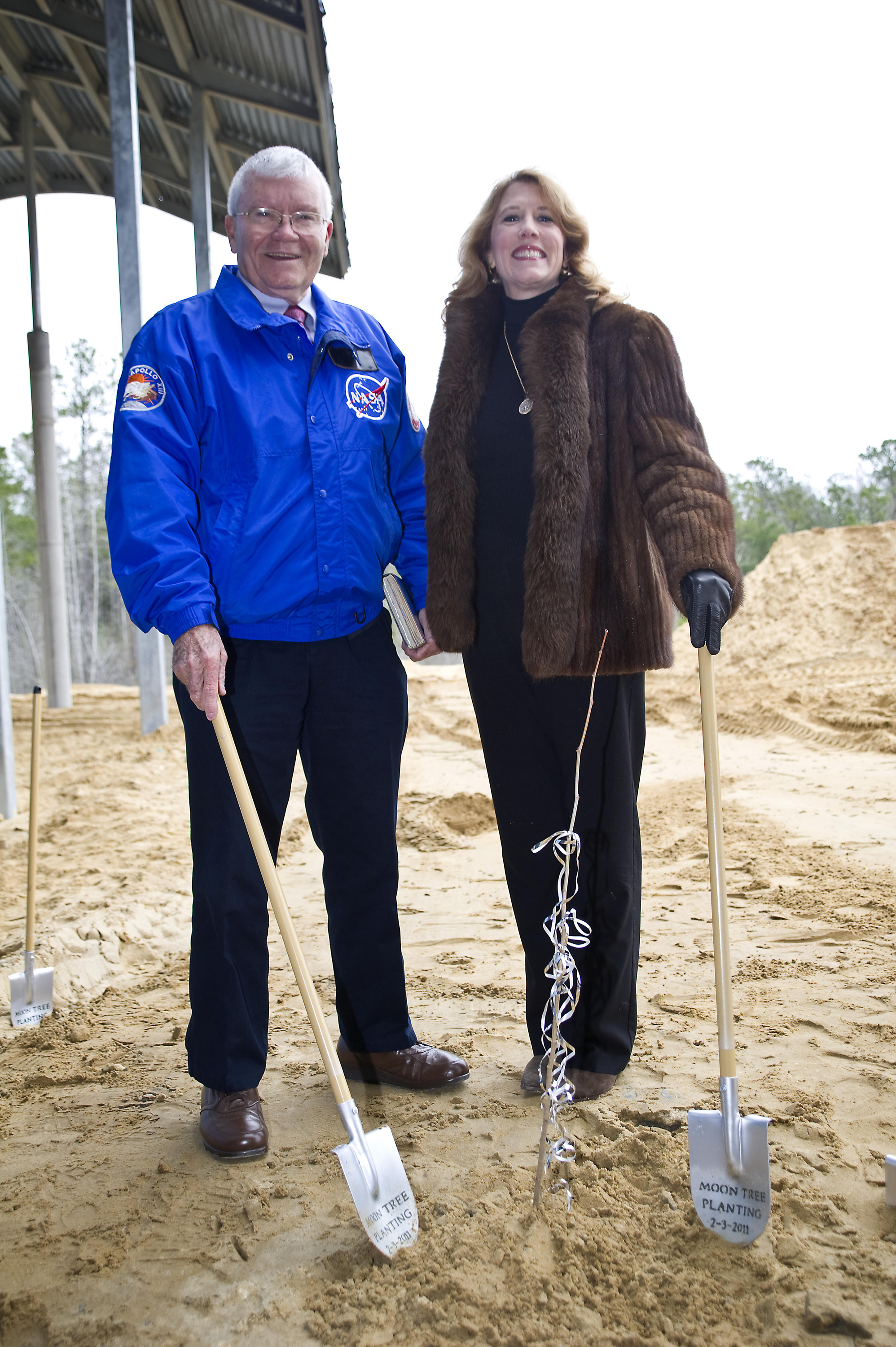 Apollo 13 astronaut Fred Haise stands with Rosemary Roosa, daughter of late Apollo 14 astronaut Stuart Roosa, beside a 'moon tree' planted at the INFINITY science center on Feb. 3, 2011. The moon tree is a descendent of seeds carried into space by Stuart Roosa on the Apollo 14 mission in 1971.