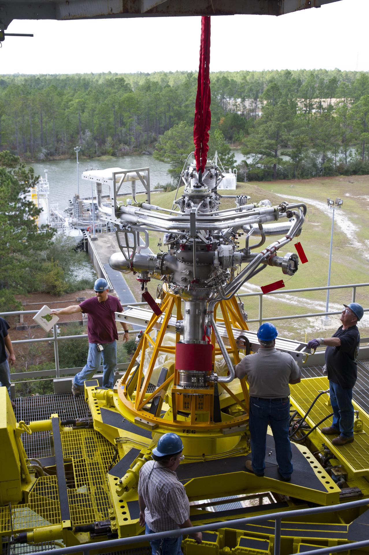 Stennis Space Center employees install the J-2X powerpack Dec. 5 in preparation for testing of the component, beginning in early 2012. The J-2X rocket engine is being developed as part of NASA's new Space Launch System.