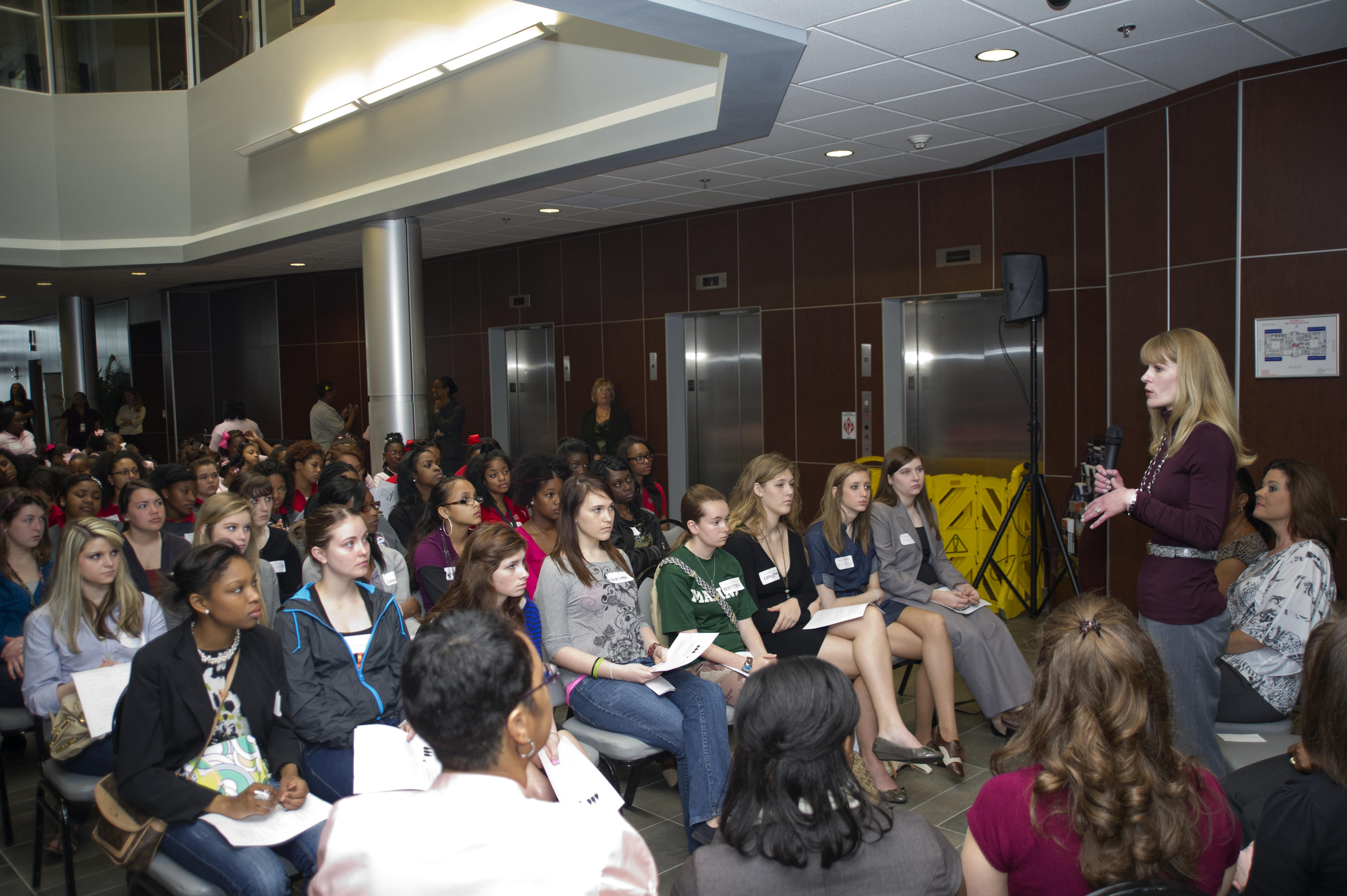 NASA Human Resources Specialist Ashley Speed speaks to a group of high school students from area schools during a Girls Excited about Math and Science event at Stennis Space Center on March 8, 2012. About 170 high school and elementary girls from area schools visited Stennis to participate in a day of activities designed to promote studies in science and mathematics.