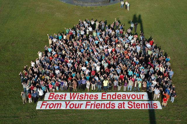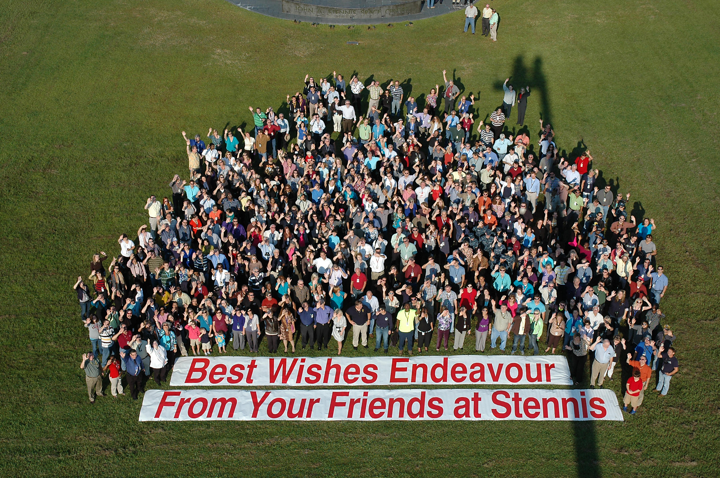 Stennis Space Center employees turned out in force to cheer space shuttle Endeavour as it flew low over the rocket engine test facility early on the morning of Sept. 19. The shuttle is headed to Los Angeles, where it will be on display at the California Science Center. Stennis employees applauded and cheered as the retired shuttle passed low overhead. In addition to those gathered on the lawn in front of the Roy S. Estess Building, many congregated on building rooftops and on facility test stands to view the flyover.