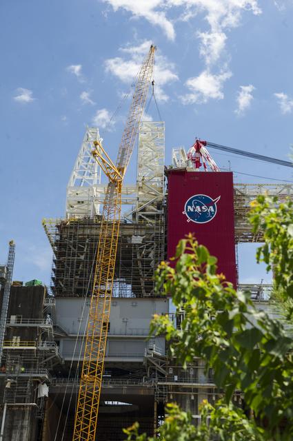 A structural steel section is lifted into place atop the B-2 Test Stand at NASA’s Stennis Space Center as part of modification work to prepare for testing the core stage of NASA’s new Space Launch System. The section is part of the Main Propulsion Test Article (MPTA) framework, which will support the SLS core stage for testing. The existing framework was installed on the stand in the late 1970s to test the shuttle MPTA. However, that framework had to be repositioned and modified to accommodate the larger SLS stage. About 1 million pounds of structural steel has been added, extending the framework about 100 feet higher and providing a new look to the Stennis skyline. Stennis will test the actual flight core stage for the first uncrewed SLS mission, Exploration Mission-1.