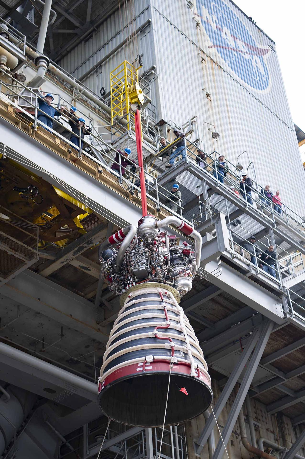 Teams at NASA’s Stennis Space Center deliver, lift, and install the first new production RS-25 engine on the Fred Haise Test Stand on Feb. 18.