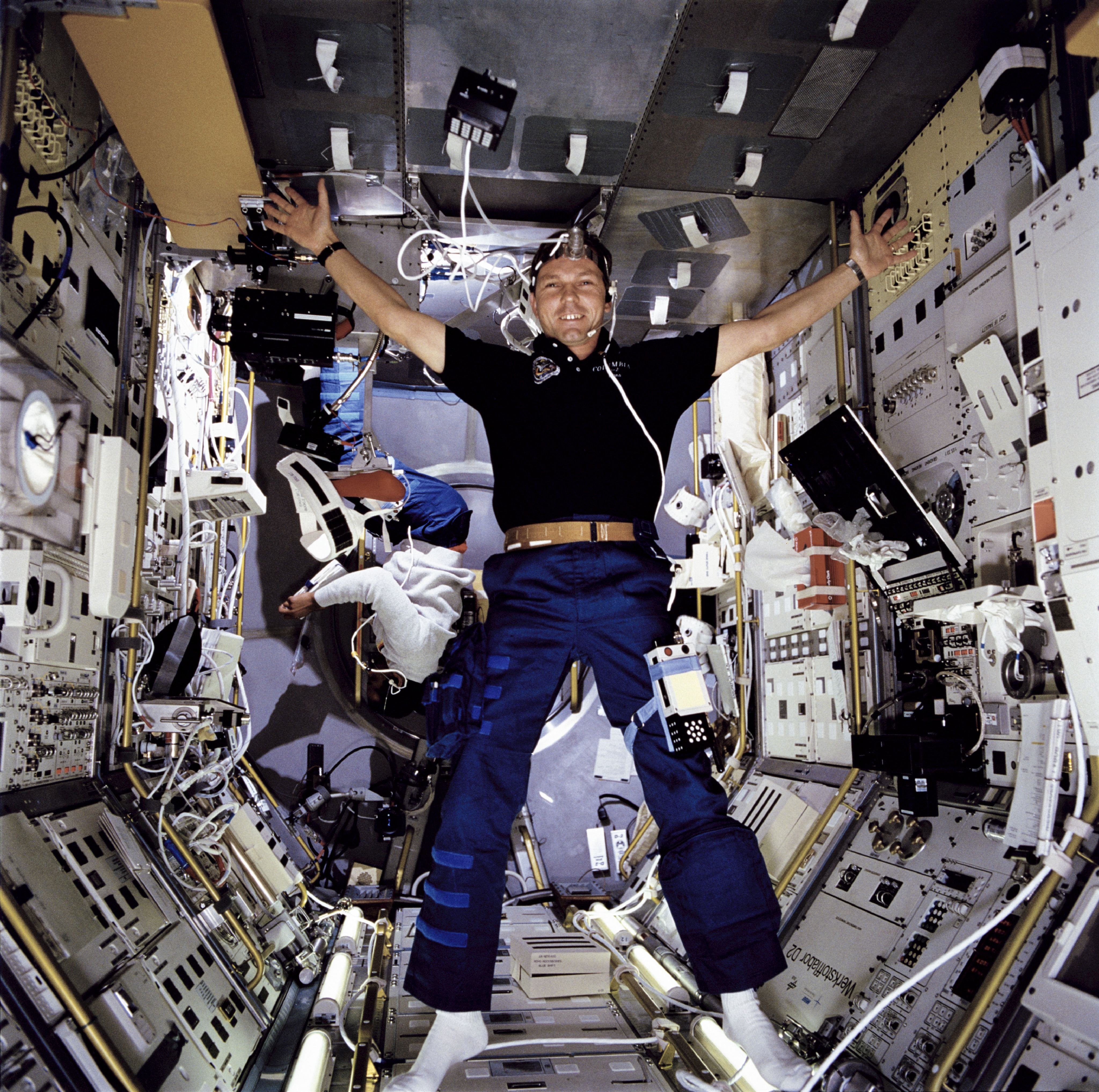 STS055-106-090 (26 April- 6 May 1993) --- Hans Schlegel, one of two STS-55 payload specialists representing the German Aerospace Research Establishment (DLR) onboard the Space Shuttle Columbia, finds plenty of room to "spread out" while participating in a Tissue experiment. Astronaut Bernard A. Harris, Jr., mission specialist, monitors an experiment in the background.