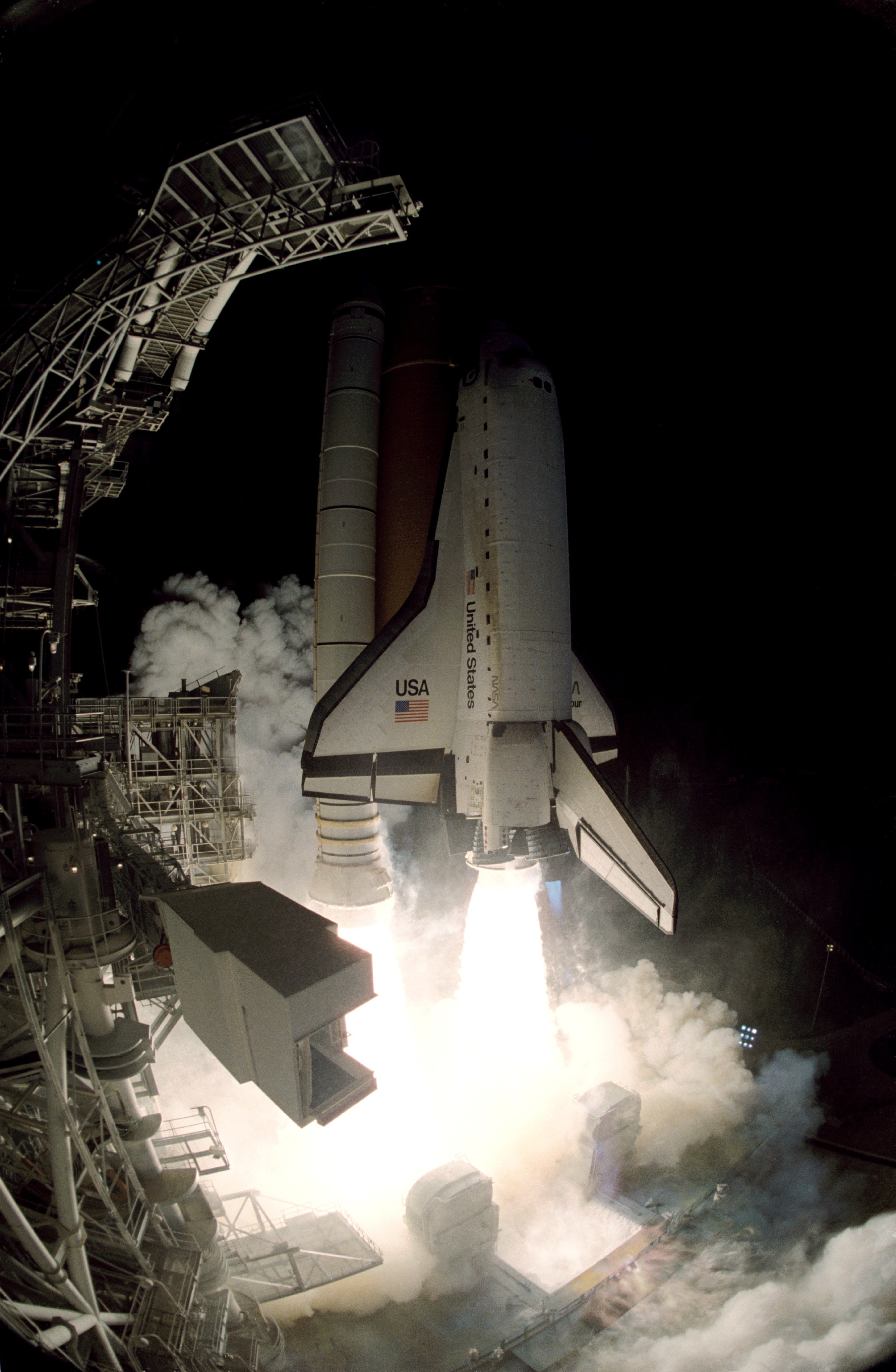 STS072-S-003 (11 Jan. 1996) --- A "fish-eye" lens was used to afford this unique view of the Space Shuttle Endeavour as it lifts off from Launch Pad 39B at the Kennedy Space Center (KSC). Liftoff for STS-72 occurred at 4:41:00:072 a.m. (EST), January 11, 1996. Onboard the spacecraft were astronauts Brian Duffy, commander; Brent W. Jett, pilot; along with Daniel T. Barry, Leroy Chiao, Winston E. Scott and Koichi Wakata, all mission specialists. Wakata represents Japan's National Space Development Agency (NASDA).