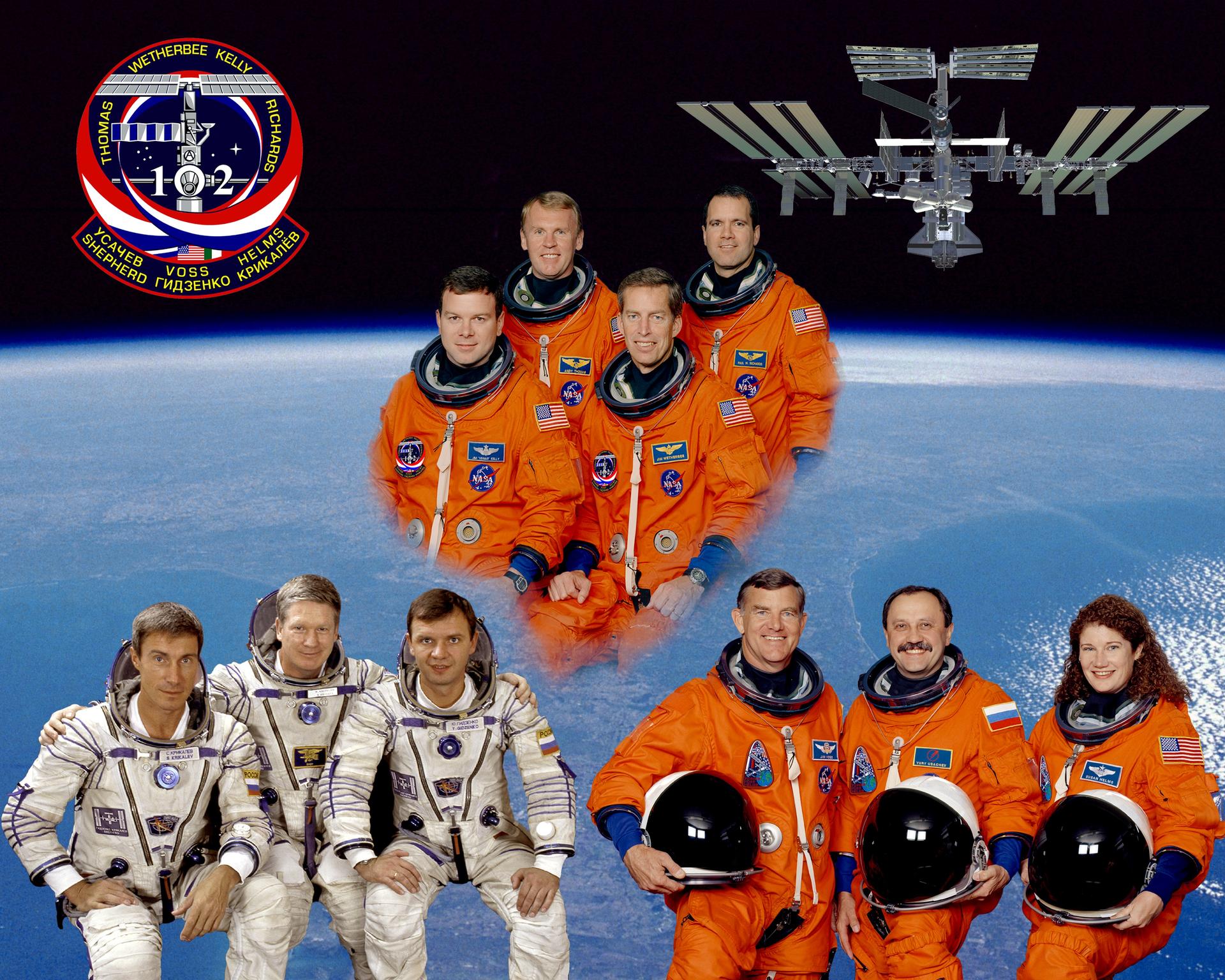 STS102-S-002 (February 2001)--- With the full-time occupancy of the International Space Station (ISS), Space Transportation System crew portraits have taken on a new look. These ten astronauts and cosmonauts represent the base STS-102 space travelers, as well as the crew members for the station crews switching out turns aboard the outpost. In the top group are, from the left, astronauts James M. Kelly, pilot; Andrew S.W. Thomas, mission specialist; James D. Wetherbee, mission commander; and Paul W. Richards, mission specialist. The bottom left grouping is the Expedition One crew, which includes, from left, cosmonaut Sergei K. Krikalev, flight engineer; astronaut William M. (Bill) Shepherd, commander; and cosmonaut Yuri P. Gidzenko, Soyuz commander. At bottom right is crew who will replace Shepherd's crew aboard the station, from the left, astronaut James S. Voss; cosmonaut Yury V. Usachev, Expedition Two commander; and astronaut Susan J. Helms. Usachev, Krikalev and Gidzenko all represent Rosaviakosmos.