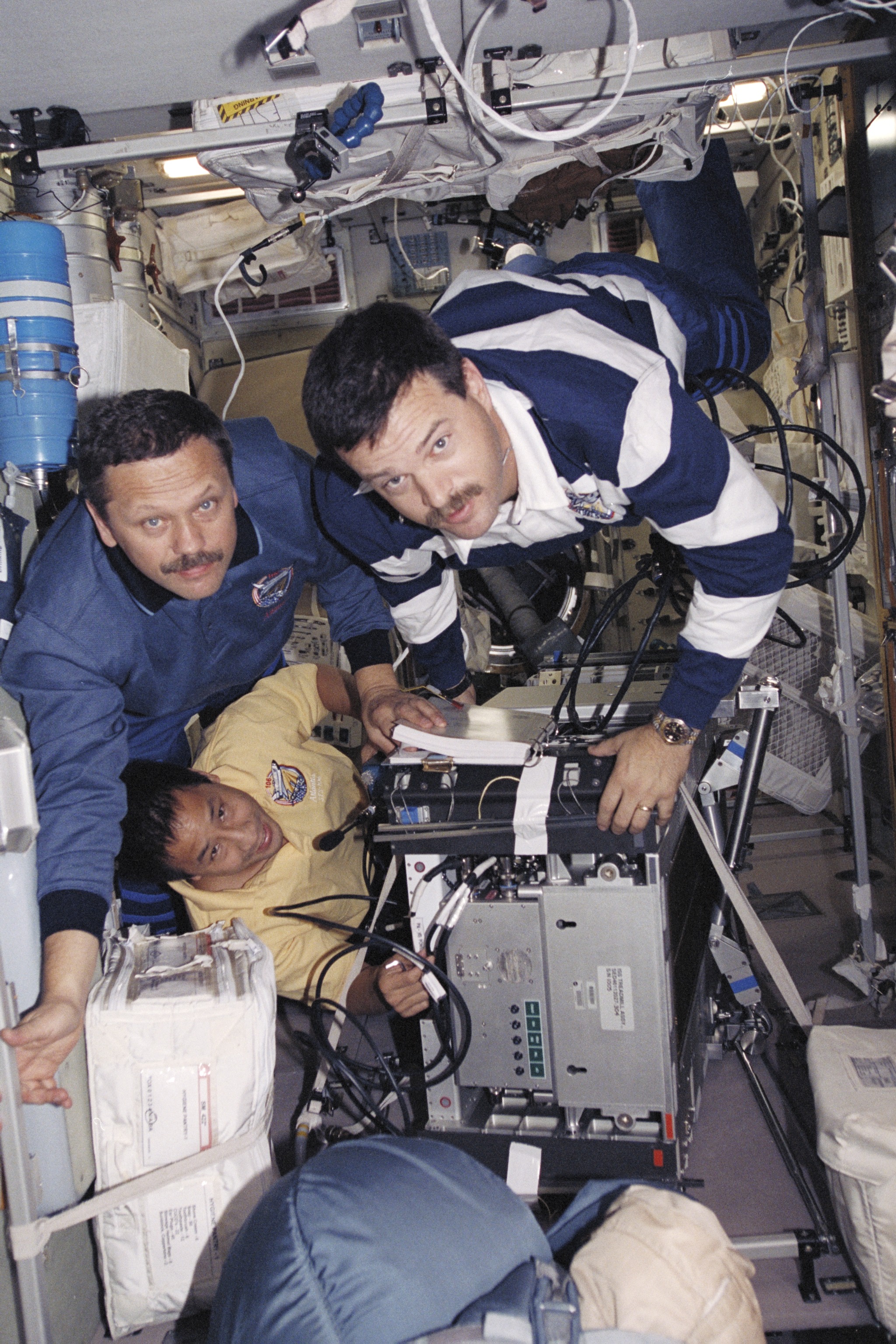 STS106-373-004 (8-20 September 2000) --- Three members of the STS-106 crew move the treadmill device. They are (counterclockwise from bottom) astronaut Edward T. Lu and cosmonaut Boris V. Morukov, both mission specialists, along with astronaut Scott D. Altman, pilot.