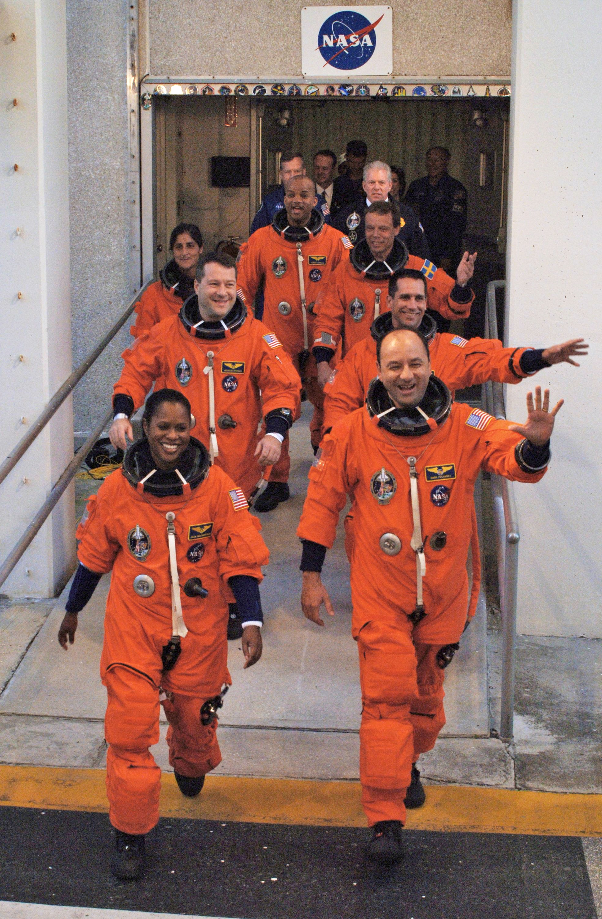 STS116-S-005 (9 Dec. 2006) --- After suiting up, the STS-116 crewmembers exit the Operations and Checkout Building to board the Astrovan, which will take them to launch pad 39B at Kennedy Space Center. On the right (front to back) are astronauts Mark L. Polansky, commander; William S. (Bill) Oefelein, pilot; and Christer Fuglesang, mission specialists representing the European Space Agency (ESA). On the left (front to back) are astronauts Joan E. Higginbotham, Nicholas J. M. Patrick, Sunita L. Williams and Robert L. Curbeam, Jr., all mission specialists. Discovery's seven-member crew will link up with the International Space Station on Monday, Dec. 11, to begin a complex, week-long stay that will rewire the outpost and increase its power supply. During three spacewalks and intricate choreography with ground controllers, the astronauts will bring electrical power on line generated by a giant solar array wing delivered to the station in September.