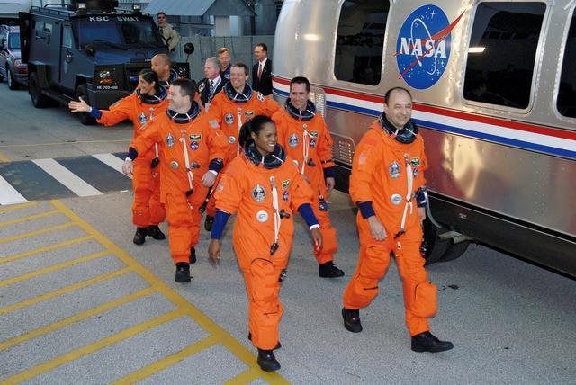 STS116-S-006 (9 Dec. 2006) --- After suiting up, the STS-116 crewmembers exit the Operations and Checkout Building to board the Astrovan, which will take them to launch pad 39B at Kennedy Space Center. On the right (front to back) are astronauts Mark L. Polansky, commander; William S. (Bill) Oefelein, pilot; and Christer Fuglesang, mission specialists representing the European Space Agency (ESA). On the left (front to back) are astronauts Joan E. Higginbotham, Nicholas J. M. Patrick, Sunita L. Williams and Robert L. Curbeam, Jr., all mission specialists. Discovery's seven-member crew will link up with the International Space Station on Monday, Dec. 11, to begin a complex, week-long stay that will rewire the outpost and increase its power supply. During three spacewalks and intricate choreography with ground controllers, the astronauts will bring electrical power on line generated by a giant solar array wing delivered to the station in September.