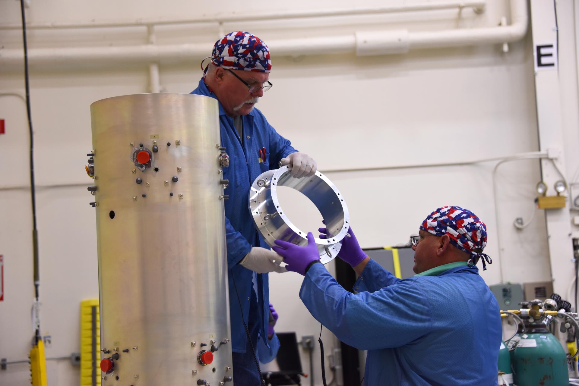 Technicians with Orbital ATK check assemble the micro satellites deployment module for NASA’s Cyclone Global Navigation Satellite System (CYGNSS) in Building 1555 at Vandenberg Air Force Base in California. CYGNSS is being prepared at Vandenberg, and then will be transported to NASA’s Kennedy Space Center in Florida aboard the Orbital ATK Pegasus XL rocket which will be attached to the Orbital ATK L-1011 carrier aircraft. CYGNSS will launch on the Pegasus XL rocket from the Skid Strip at Cape Canaveral Air Force Station. CYGNSS will make frequent and accurate measurements of ocean surface winds throughout the life cycle of tropical storms and hurricanes. The data that CYGNSS provides will enable scientists to probe key air-sea interaction processes that take place near the core of storms, which are rapidly changing and play a critical role in the beginning and intensification of hurricanes.