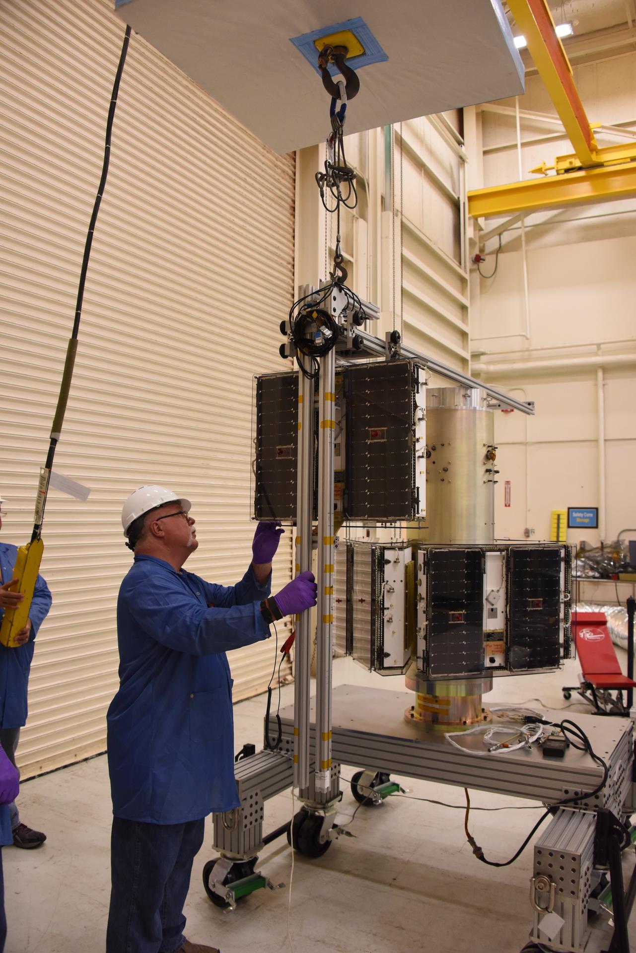 A technician with Orbital ATK prepares to install another micro satellite on the deployment module for NASA’s Cyclone Global Navigation Satellite System (CYGNSS) in Building 1555 at Vandenberg Air Force Base in California. CYGNSS is being prepared at Vandenberg, and then will be transported to NASA’s Kennedy Space Center in Florida aboard the Orbital ATK Pegasus XL rocket which will be attached to the Orbital ATK L-1011 carrier aircraft. CYGNSS will launch on the Pegasus XL rocket from the Skid Strip at Cape Canaveral Air Force Station. CYGNSS will make frequent and accurate measurements of ocean surface winds throughout the life cycle of tropical storms and hurricanes. The data that CYGNSS provides will enable scientists to probe key air-sea interaction processes that take place near the core of storms, which are rapidly changing and play a critical role in the beginning and intensification of hurricanes.