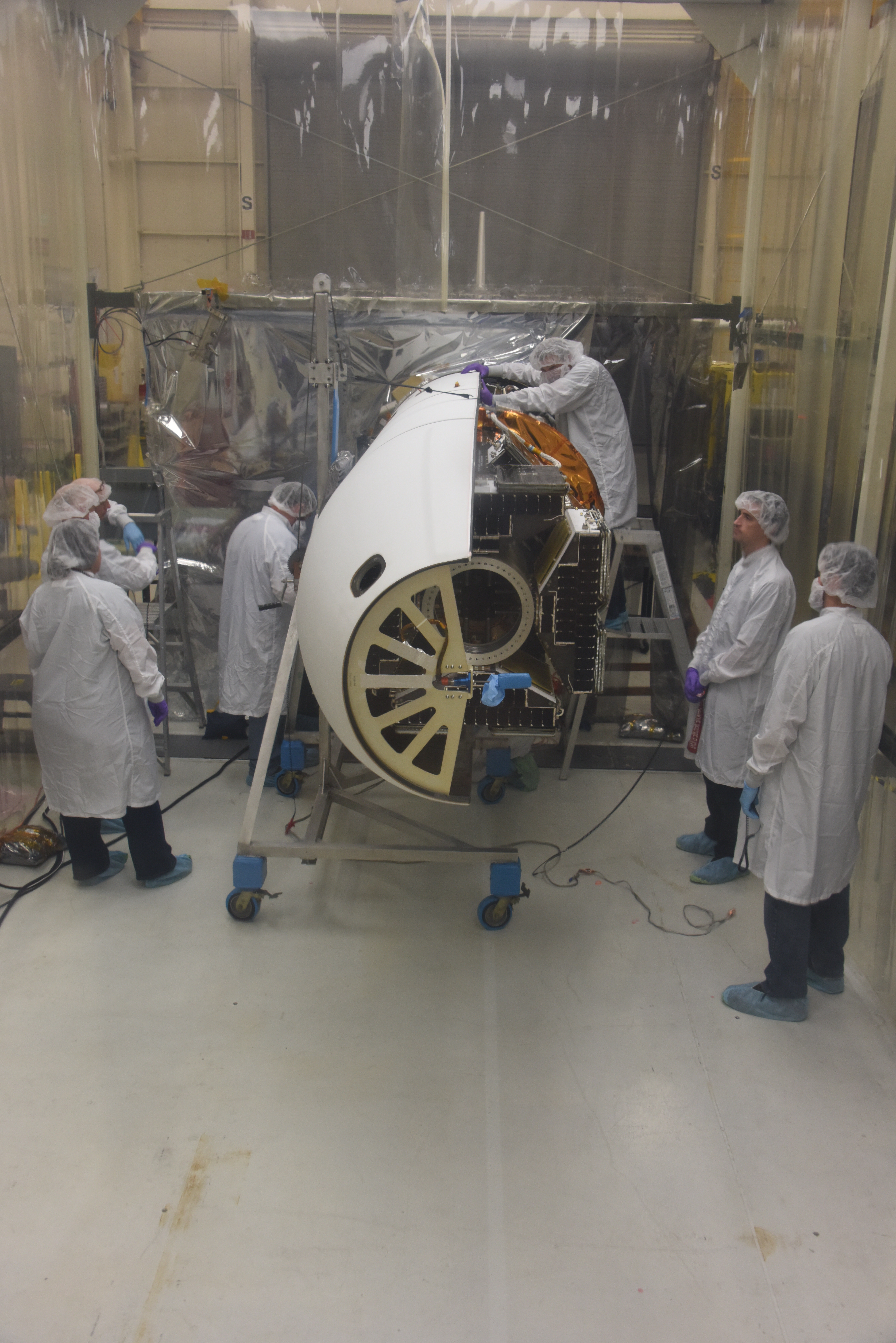 Technicians with Orbital ATK install the first half of the Pegasus XL fairing around NASA’s Cyclone Global Navigation Satellite System (CYGNSS) in Building 1555 at Vandenberg Air Force Base in California. CYGNSS is being prepared at Vandenberg, and then will be transported to NASA’s Kennedy Space Center in Florida aboard the Orbital ATK Pegasus XL rocket which will be attached to the Orbital ATK L-1011 carrier aircraft. CYGNSS will launch on the Pegasus XL rocket from the Skid Strip at Cape Canaveral Air Force Station. CYGNSS will make frequent and accurate measurements of ocean surface winds throughout the life cycle of tropical storms and hurricanes. The data that CYGNSS provides will enable scientists to probe key air-sea interaction processes that take place near the core of storms, which are rapidly changing and play a critical role in the beginning and intensification of hurricanes.