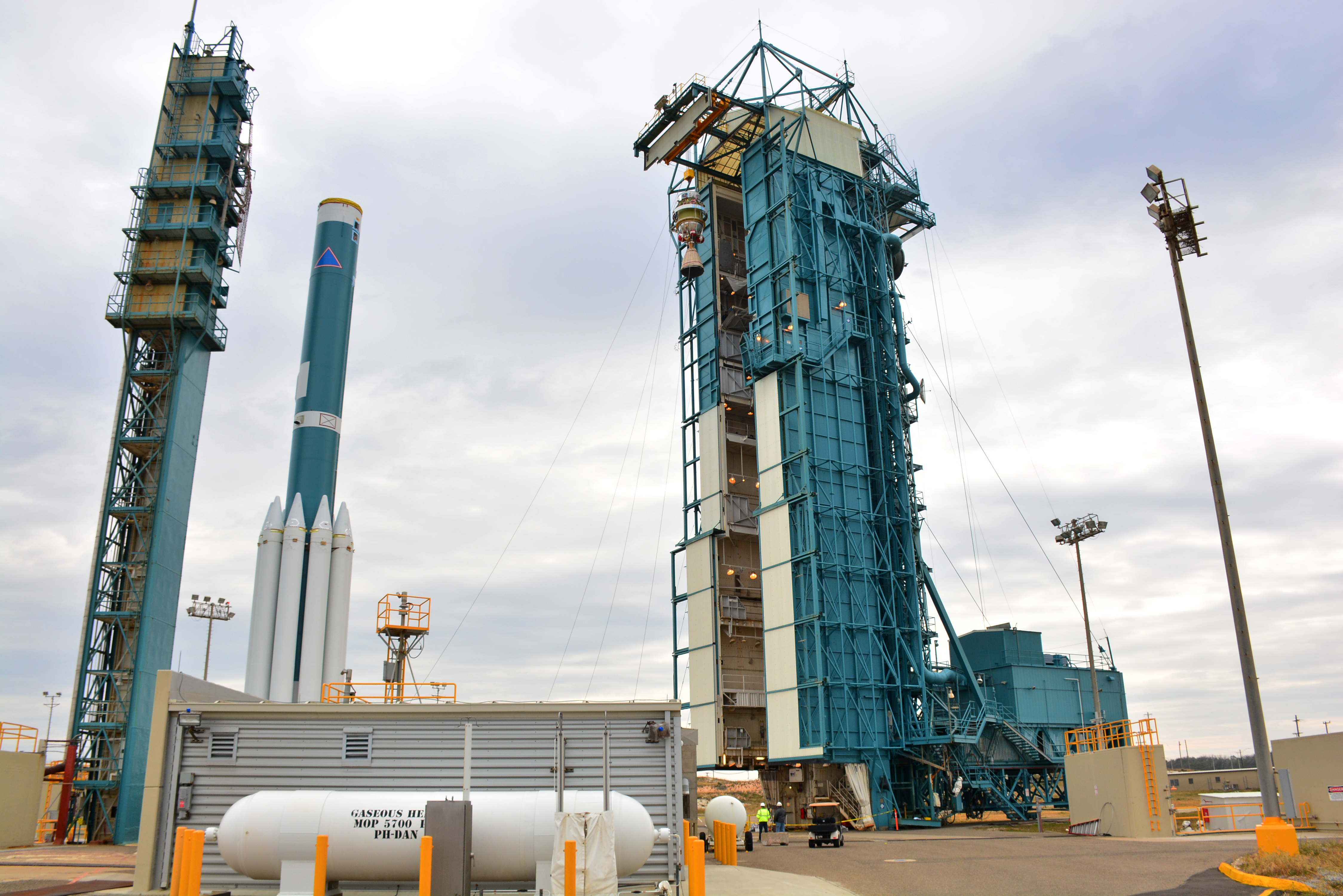 At Vandenberg Air Force Base in California, a United Launch Alliance Delta II second stage is hoisted into the gantry at Space Launch Complex 2. It will be mounted atop first stage of the rocket, seen on the left, as preparations continue for the launch of the Joint Polar Satellite System-1 (JPSS-1) later this year. JPSS, a next-generation environmental satellite system, is a collaborative program between the National Oceanic and Atmospheric Administration (NOAA) and NASA.