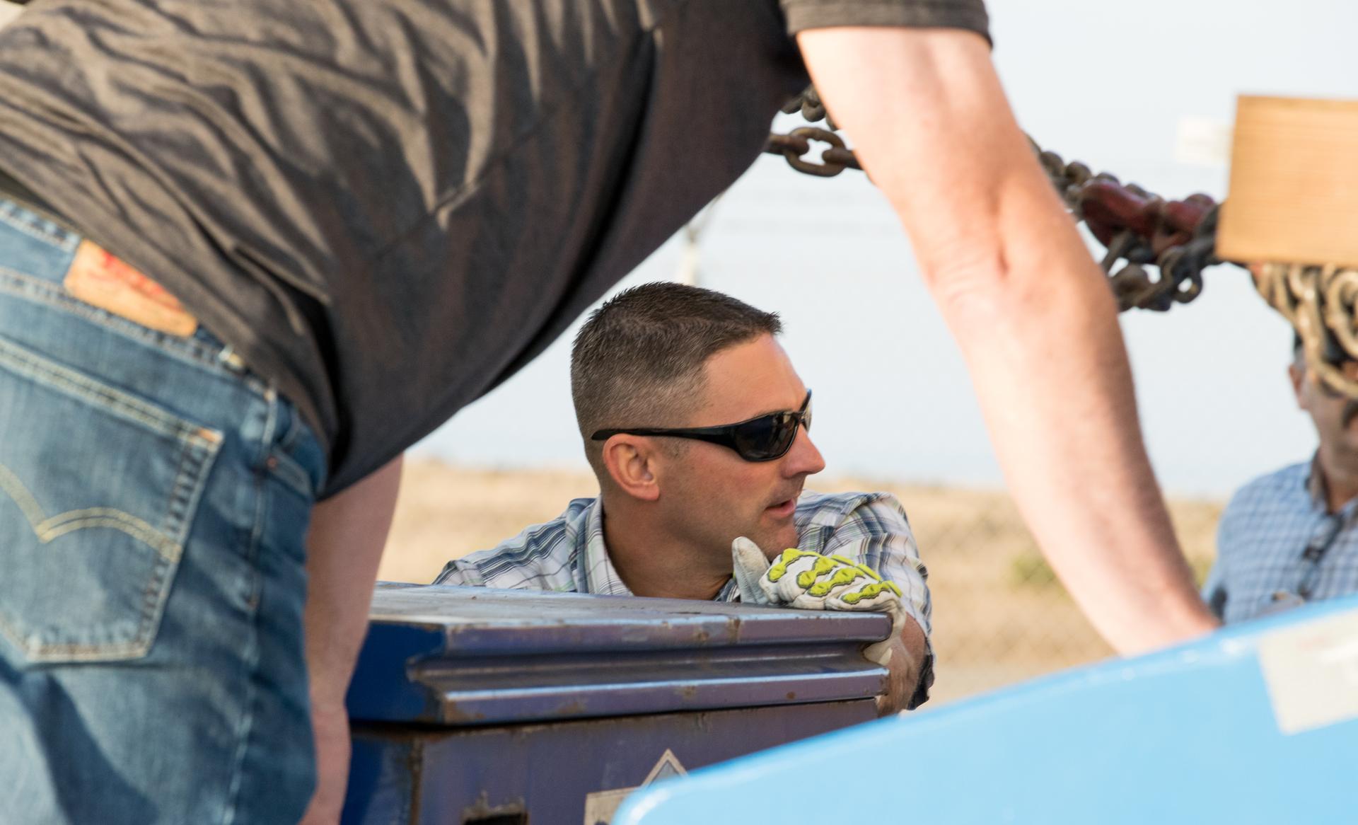 Technicians at Vandenberg Air Force Base in California inspect the shipping container for the Joint Polar Satellite System-1, or JPSS-1, as it arrives at the Astrotech Processing Facility. JPSS is the first in a series four next-generation environmental satellites in a collaborative program between the National Oceanic and Atmospheric Administration (NOAA) and NASA. The satellite is scheduled to liftoff Nov. 10, 2017 atop a United Launch Alliance Delta II rocket.