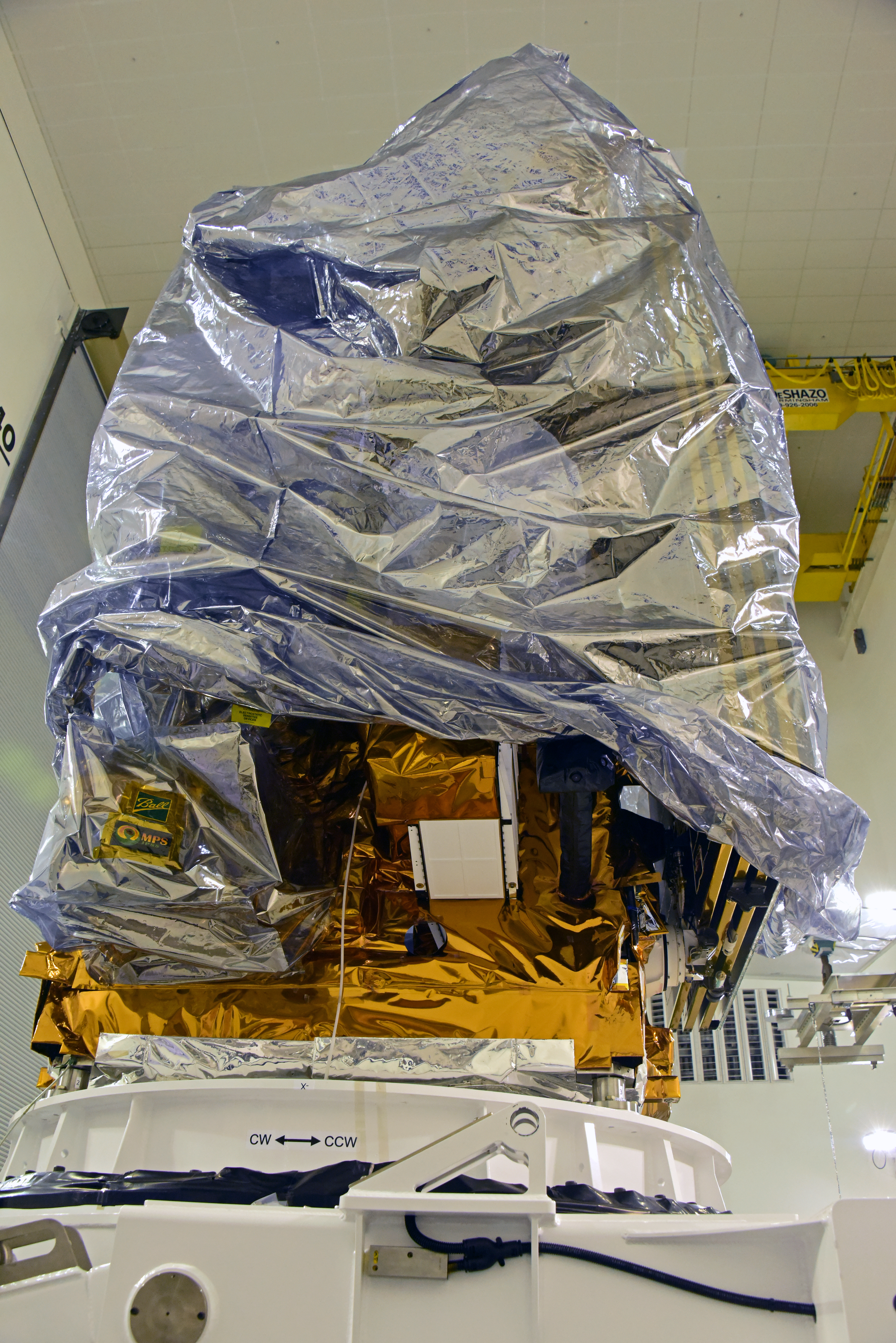 NOAA's Joint Polar Satellite System-1, or JPSS-1, remains wrapped in a protective covering after removal from its shipping container at the Astrotech Processing Facility at Vandenberg Air Force Base in California. The spacecraft is being prepared for its move to a payload attach fitting. JPSS-1 will liftoff aboard a United Launch Alliance Delta II rocket from Vandenberg's Space Launch Complex-2. JPSS-1 is the first in a series of four next-generation environmental satellites in a collaborative program between NOAA and NASA.