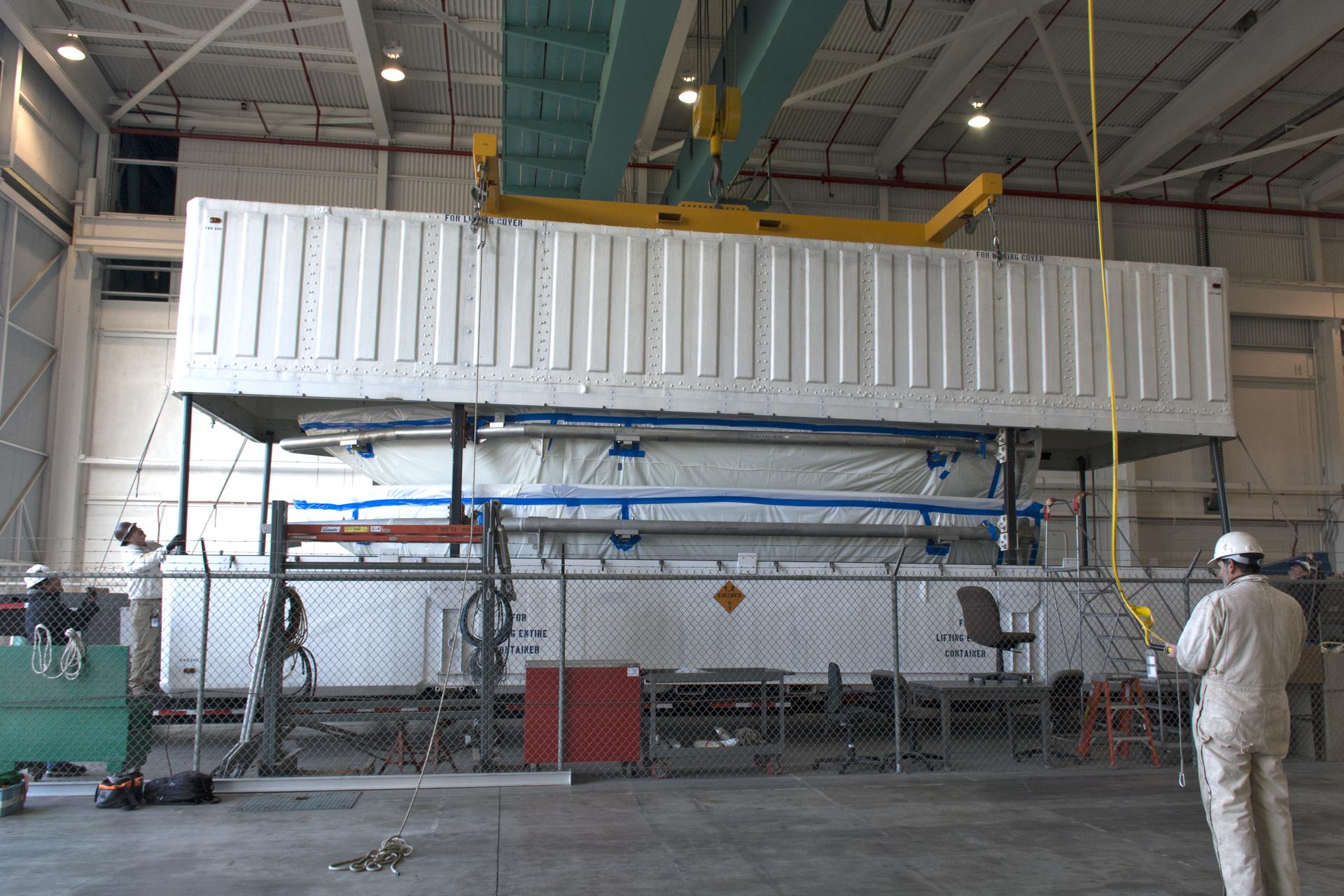 Inside Building 836 at Vandenberg Air Force Base in California, the top of the shipping container is lifted up from the payload fairings for the United Launch Alliance (ULA) Delta II rocket. NASA's Ice, Cloud and land Elevation Satellite-2 (ICESat-2) is scheduled to launch on the final ULA Delta II rocket later this year. ICESat-2 will measure the height of a changing Earth, one laser pulse at a time, 10,000 laser pulses a second. The satellite will carry a single instrument, the Advanced Topographic Laser Altimeter System. ICESat-2 will help scientists investigate why, and how much our planet's frozen and icy areas, called the cryosphere, is changing in a warming climate.