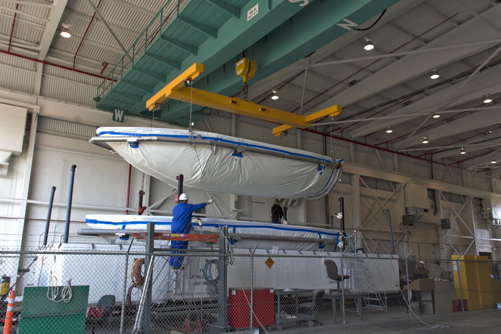 Inside Building 836 at Vandenberg Air Force Base in California, the payload fairing halves for the United Launch Alliance (ULA) Delta II rocket are lifted up from the base of their shipping container. NASA's Ice, Cloud and land Elevation Satellite-2 (ICESat-2) is scheduled to launch on the final ULA Delta II rocket later this year. ICESat-2 will measure the height of a changing Earth, one laser pulse at a time, 10,000 laser pulses a second. The satellite will carry a single instrument, the Advanced Topographic Laser Altimeter System. ICESat-2 will help scientists investigate why, and how much our planet's frozen and icy areas, called the cryosphere, is changing in a warming climate.