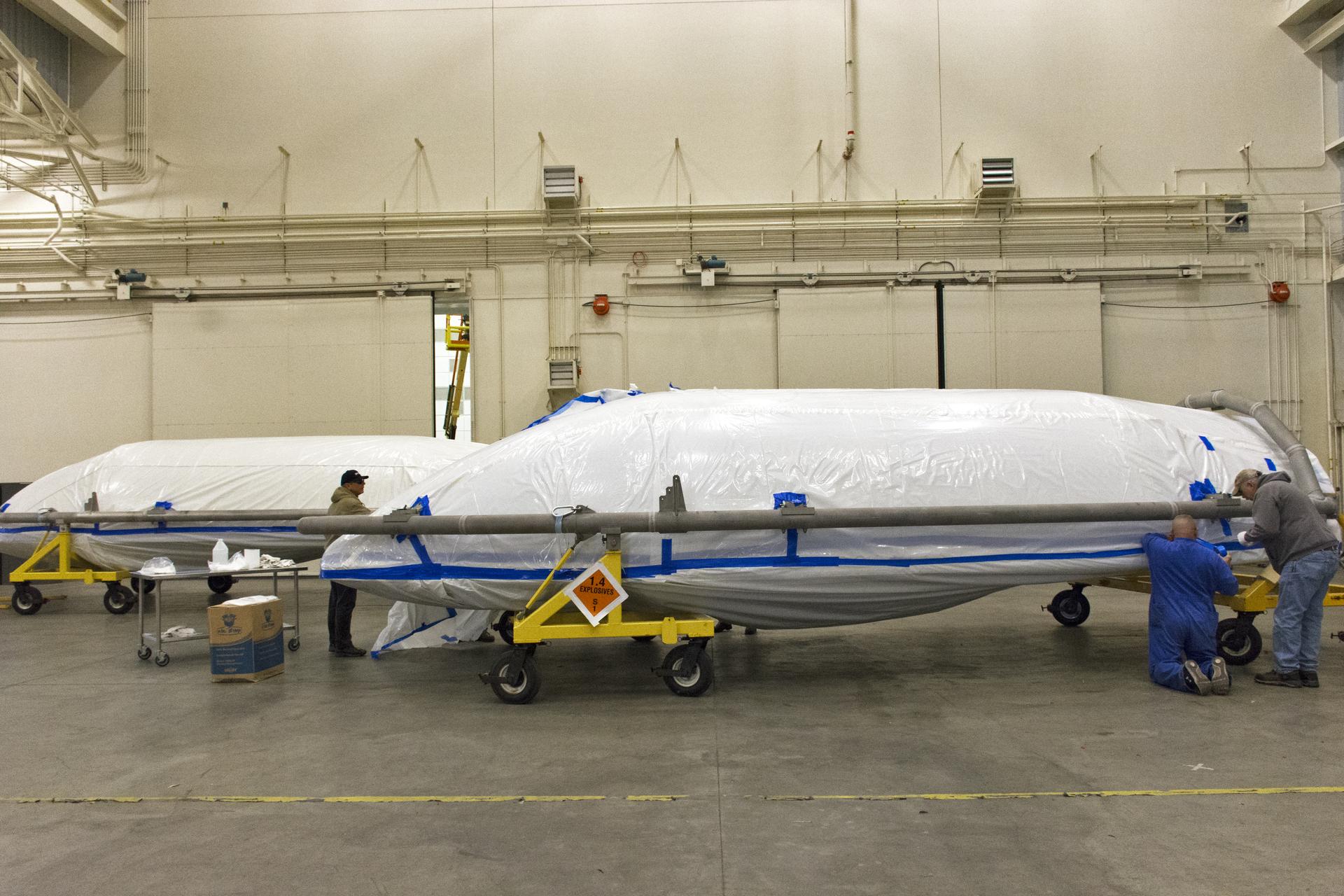 Both halves of the United Launch Alliance (ULA) Delta II rocket payload fairing were moved inside ULA's Building B8337 at Vandenberg Air Force Base in California. Technicians begin the process to remove them from their transporters. NASA's Ice, Cloud and land Elevation Satellite-2 (ICESat-2) will launch later this year on the final Delta II rocket. ICESat-2 will measure the height of a changing Earth, one laser pulse at a time, 10,000 laser pulses a second. The satellite will carry a single instrument, the Advanced Topographic Laser Altimeter System. ICESat-2 will help scientists investigate why, and how much our planet's frozen and icy areas, called the cryosphere, is changing in a warming climate.