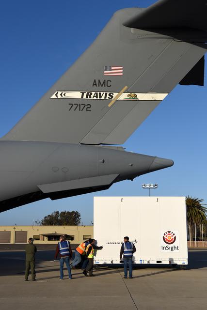 After a U.S. Air Force C-17 aircraft arrived at Vandenberg Air Force Base in California, ground crews offload NASA's Interior Exploration using Seismic Investigations, Geodesy and Heat Transport, or InSight, spacecraft designed to land on Mars. InSight was developed and built by Lockheed-Martin Space Systems in Denver, Colorado, and is scheduled for liftoff is May 5, 2018. InSight is the first mission to explore the Red Planet's deep interior. It will investigate processes that shaped the rocky planets of the inner solar system including Earth.