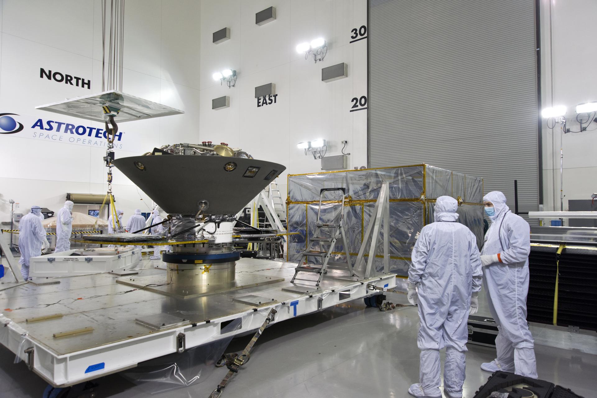 Inside the Astrotech processing facility at Vandenberg Air Force Base in California, NASA's Interior Exploration using Seismic Investigations, Geodesy and Heat Transport, or InSight, spacecraft is prepared to be lifted on to a rotation fixture for further testing. InSight was developed and built by Lockheed-Martin Space Systems in Denver, Colorado, and is scheduled for liftoff is May 5, 2018. InSight is the first mission to land on Mars and explore the Red Planet's deep interior. It will investigate processes that shaped the rocky planets of the inner solar system including Earth.