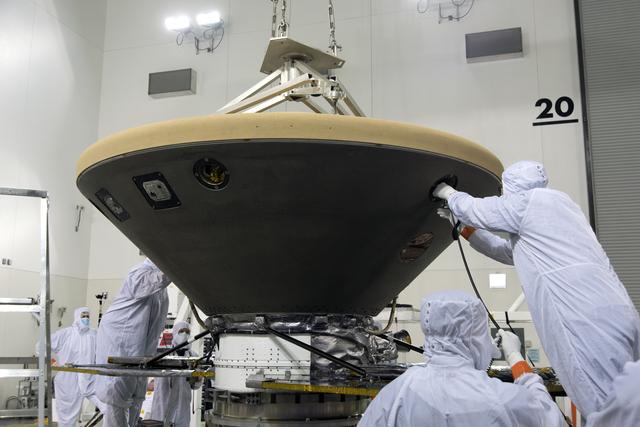 In the Astrotech facility at Vandenberg Air Force Base in California, the heatshield is placed on NASA's Interior Exploration using Seismic Investigations, Geodesy and Heat Transport, or InSight, Mars lander. InSight will be the first mission to look deep beneath the Martian surface. It will study the planet's interior by measuring its heat output and listen for marsquakes. The spacecraft will use the seismic waves generated by marsquakes to develop a map of the planet’s deep interior. The resulting insight into Mars’ formation will provide a better understanding of how other rocky planets, including Earth, were created. InSight is scheduled for liftoff May 5, 2018.