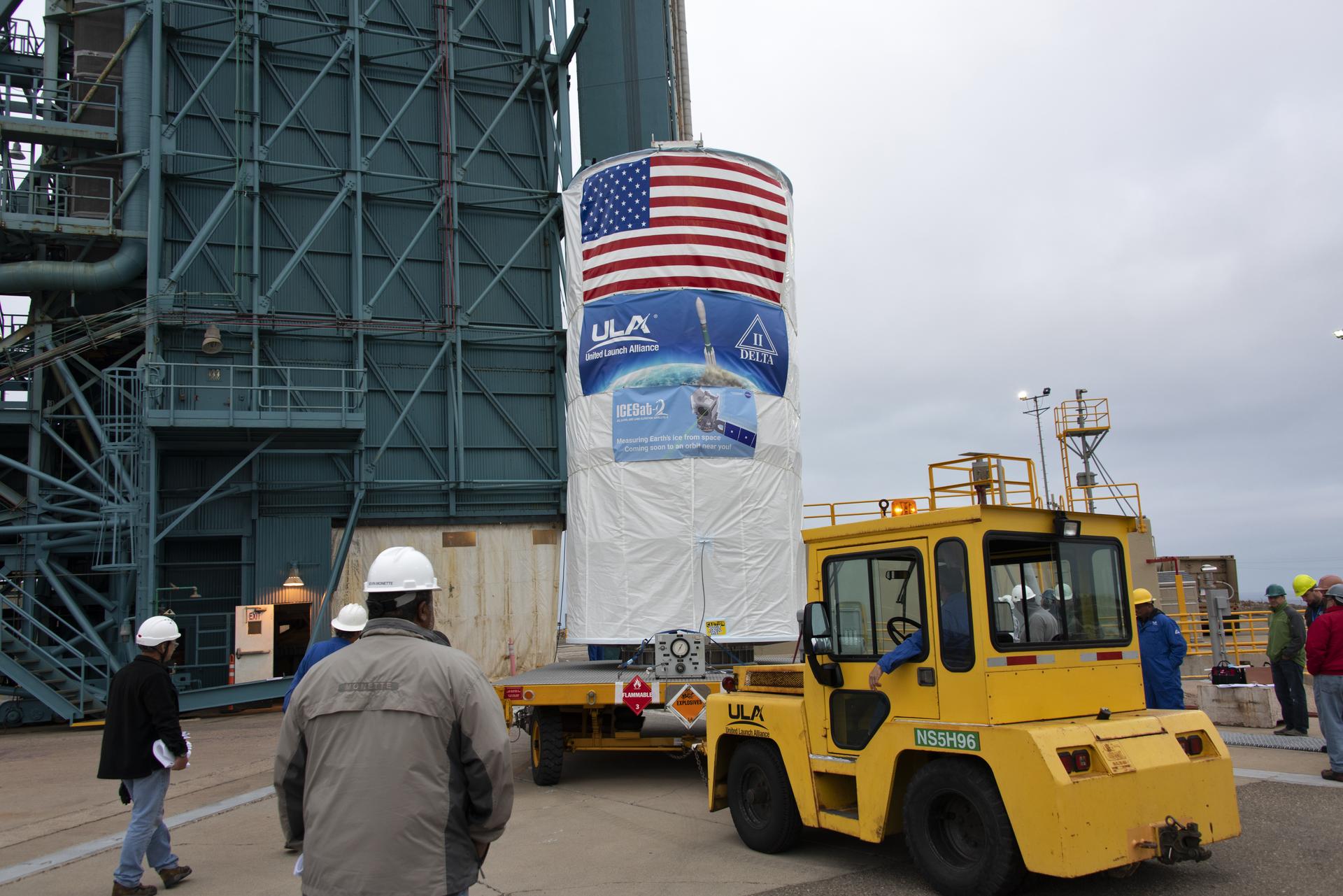 NASA's Ice, Cloud and land Elevation Satellite-2 (ICESat-2), encased in its protective covering, arrives at the mobile service tower at Space Launch Complex 2 at Vandenberg Air Force Base in California, on Aug. 26, 2018. The satellite will be hoisted up by crane and attached to the United Launch Alliance Delta II rocket. Launch is scheduled for Sept. 15, 2018. ICESat-2 will measure the height of a changing Earth, one laser pulse at a time, 10,000 laser pulses a second. The satellite will carry the Advanced Topographic Laser Altimeter System (ATLAS). ICESat-2 will help scientists investigate why, and how much our planet's frozen and icy areas, called the cryosphere, are changing in a warming climate.