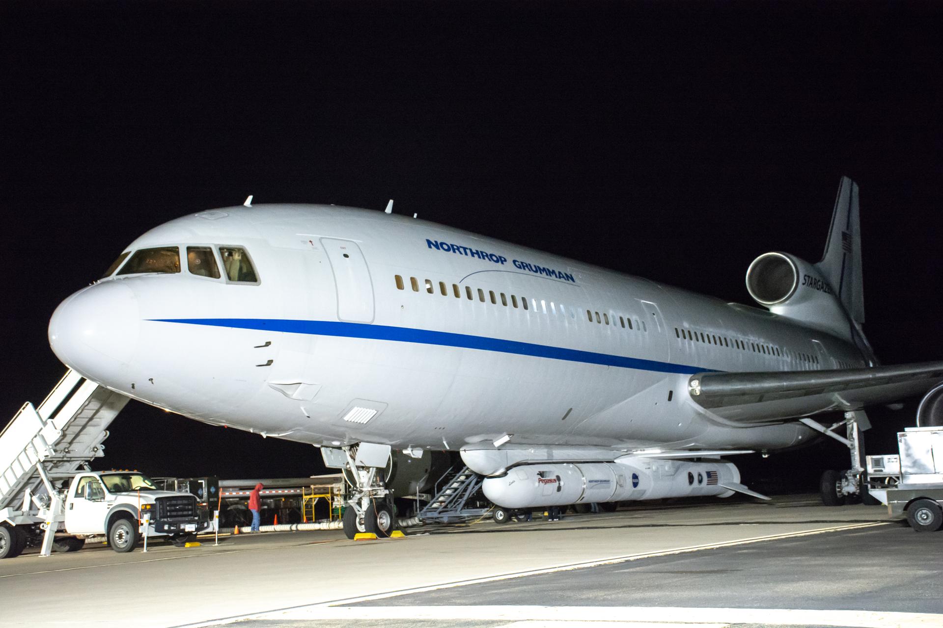 Northrop Grumman's L-1011 Stargazer is undergoing final preparations prior to its takeoff from Vandenberg Air Force Base in California on Oct. 1, 2019. The company's Pegasus XL rocket, containing NASA's Ionospheric Connection Explorer (ICON), is attached beneath the aircraft. The explorer is targeted to launch on Oct. 9, 2019, from Cape Canaveral Air Force Station in Florida. ICON will study the frontier of space - the dynamic zone high in Earth's atmosphere where terrestrial weather from below meets space weather above.