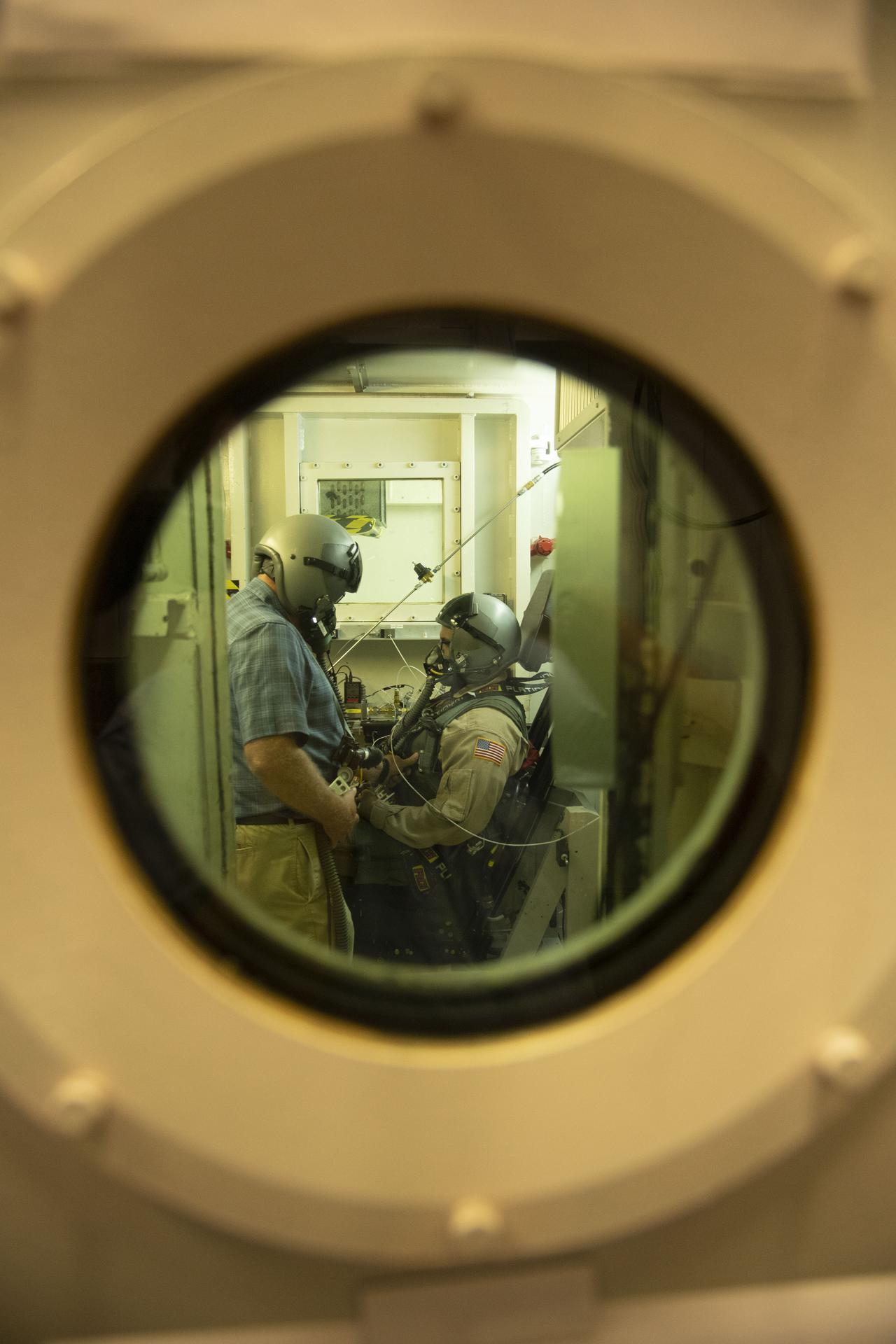 The low pressure (hypobaric) chamber at KBR’s facility in San Antonio, Texas, simulates very high altitudes by reducing the air pressure inside of the chamber. The subject inside the chamber experiences the reduced pressure conditions that exist at higher altitudes, in this case altitudes up to 60,000 feet.