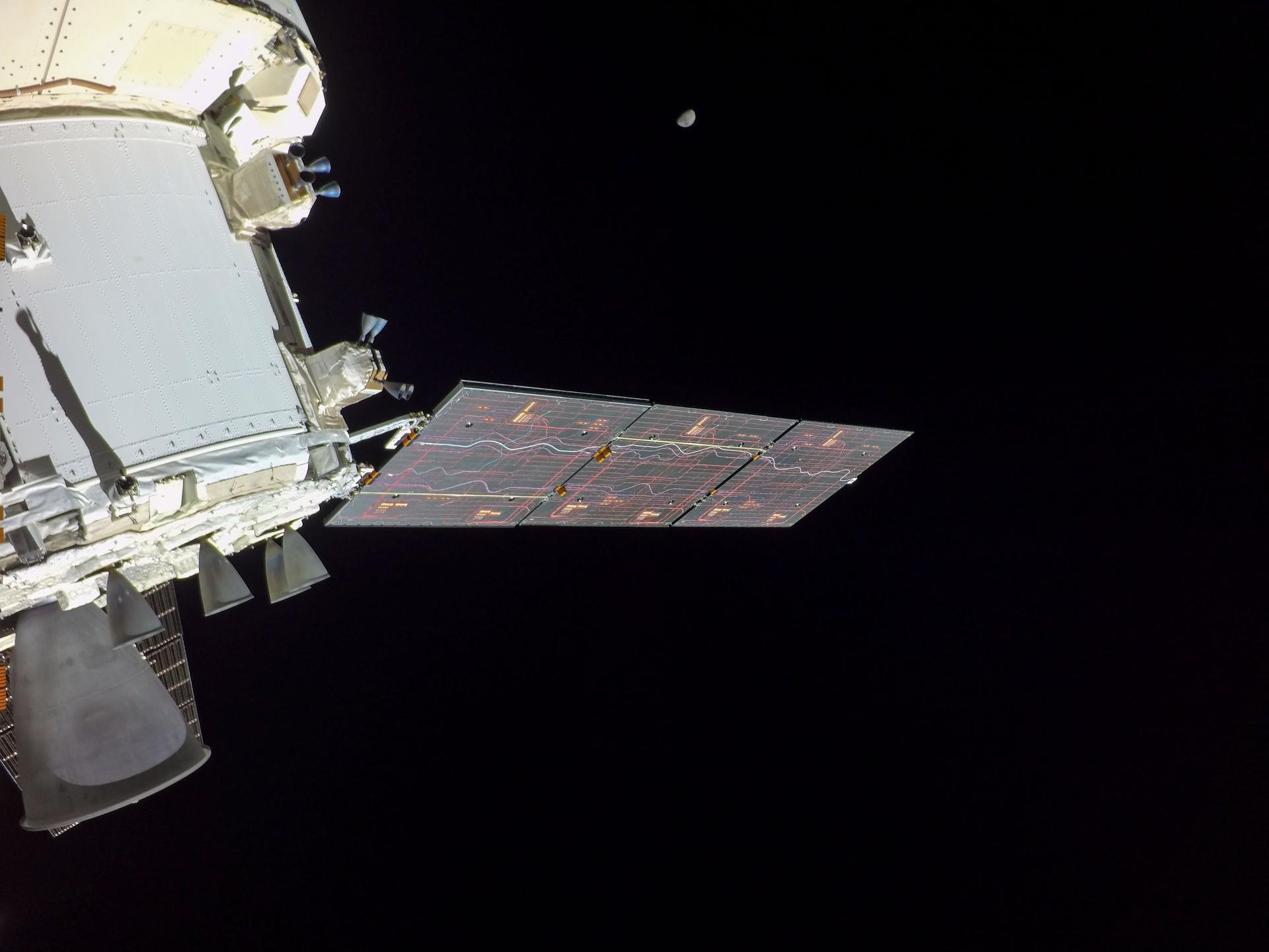 art001e002202 (Dec. 8, 2022) On flight day 23 of NASA’s Artemis I mission, Orion’s solar array wing camera looked back at the Moon as the spacecraft continued its journey back to Earth ahead of a splashdown off the west coast of North America on Dec. 11.