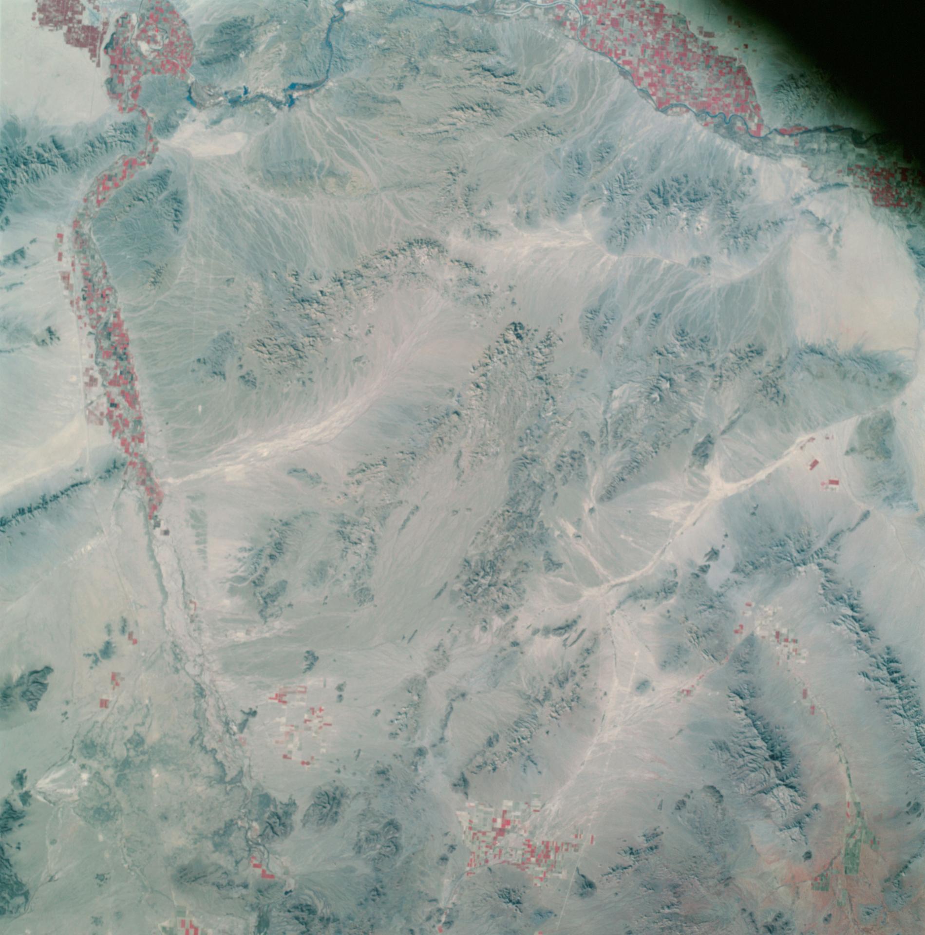 AS09-26A-3800A (12 March 1969) --- Color infrared photograph of southwestern Arizona, Yuma-Gila Desert-Gila River-Colorado River area, taken on March 12, 1969, by one of the four synchronized cameras of the Apollo 9 Earth Resources Survey SO65 Experiment. At 11:28 a.m. (EST) when this picture was made the Apollo 9 spacecraft was at an altitude of 128 nautical miles, and the sun elevation was 30 degrees above the horizon. The location of the point on Earth's surface at which the four-camera combination was aimed 33 degrees 19 minutes north latitude, and 113 degrees 45 minutes west longitude. The other three cameras used: (B) black and white film with a red filter; (C) black and white infrared film; and (D) black and white film with a green filter.