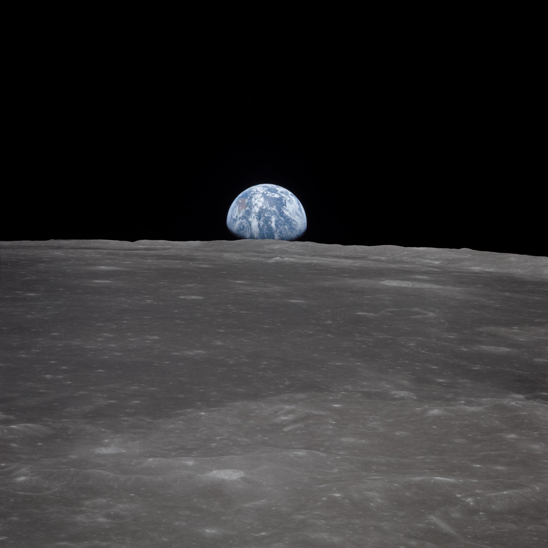 JOHNSON SPACE CENTER, HOUSTON, TEXAS - A view of the Earth appears over the lunar horizon as the Apollo 11 Command Module comes into view of the Moon before astronauts Neil Armstrong and Edwin Aldrin Jr. leave in the Lunar Module, Eagle, to become the first men to walk on the Moon's surface.