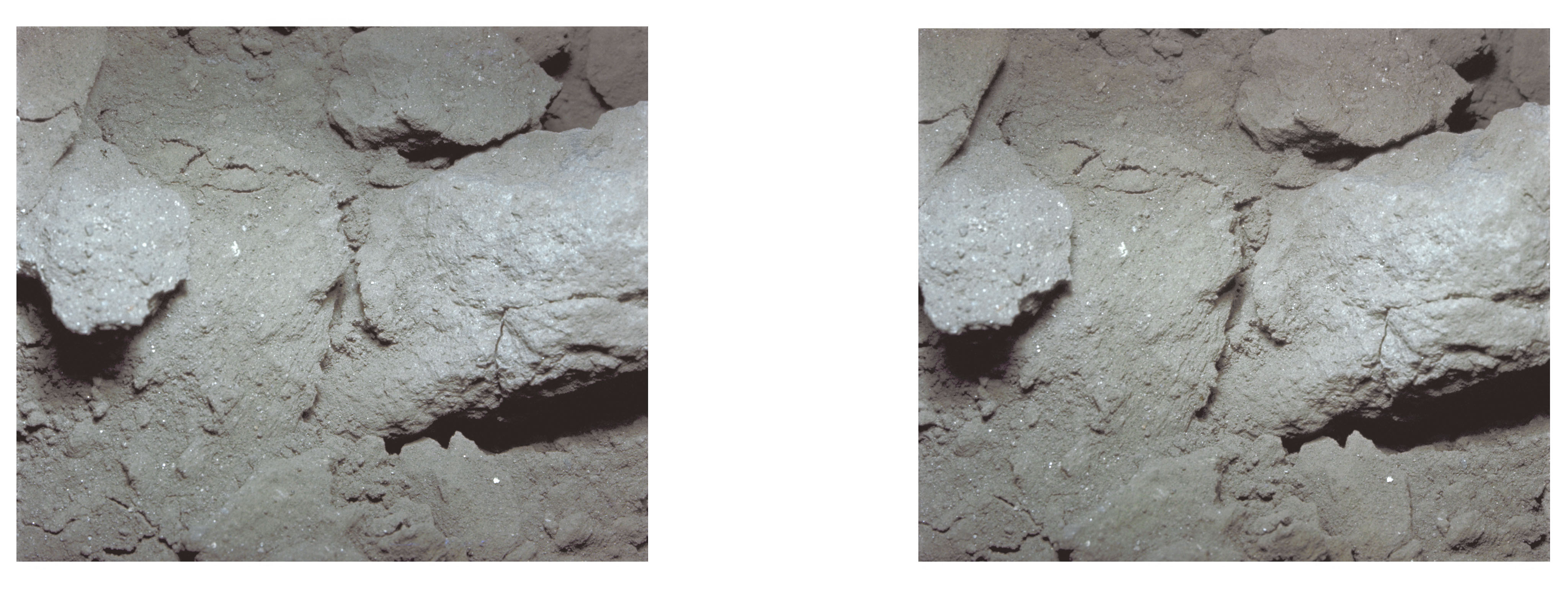 AS11-45-6706 (20 July 1969) --- An Apollo 11 stereo view showing a clump of lunar surface powder, with various small pieces of different color. Many small, shiny spherical particles can be seen. The picture is three inches across. The exposure was made by the Apollo 11 35mm stereo close-up camera. The camera was specially developed to get the highest possible resolution of a small area. A three-inch square area is photographed with a flash illumination and at a fixed distance. The camera is mounted on a walking stick, and the astronauts use it by holding it up against the object to be photographed and pulling the trigger. The pictures are in color and give a stereo view, enabling the fine detail to be seen very clearly. The project is under the direction of Professor T. Gold of Cornell University and Mr. F. Pearce of NASA. The camera was designed and built by Eastman Kodak. Professor E. Purcell of Harvard University and Dr. E. Land of the Polaroid Corporation have contributed to the project. The pictures brought back from the moon by the Apollo 11 crew are of excellent quality and allow fine detail of the undisturbed lunar surface to be seen. Scientists hope to be able to deduce from them some of the processes that have taken place that have shaped and modified the surface.