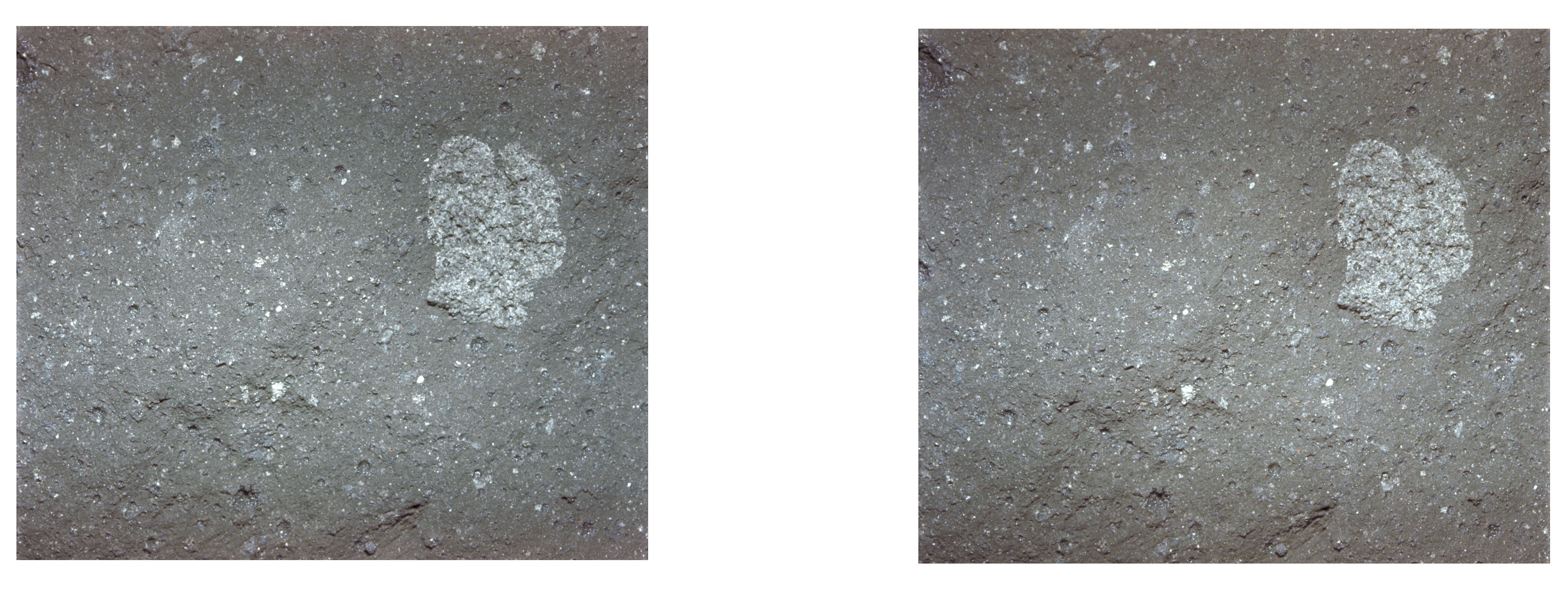 Apollo 11 stereo view showing lump of surface powder with colored material