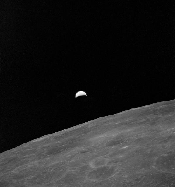 AS15-99-13445 (31 July 1971) --- This ultra violet picture of Earth rising over the lunar surface was taken from the Command Module (CM) Endeavor during the 24th revolution of the moon. Astronaut Alfred M. Worden Jr., Apollo 15 command module pilot, remained with the Command and Service Modules (CSM) in lunar orbit while astronauts David R. Scott, commander, and James B. Irwin, lunar module pilot, descended in the Lunar Module (LM) to explore the Hadley-Apennine area of the moon. Photo credit: NASA