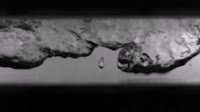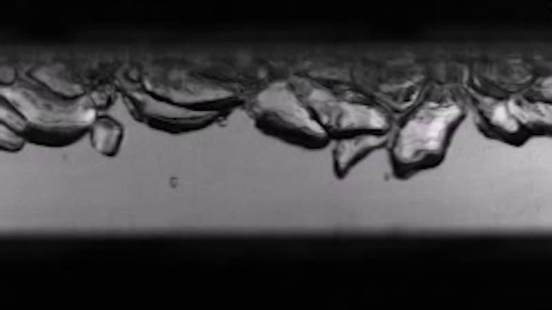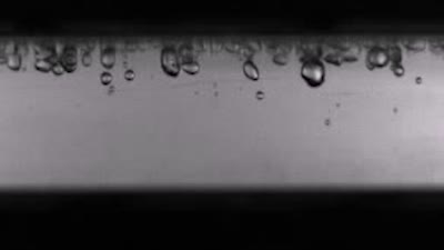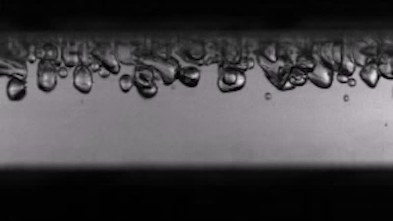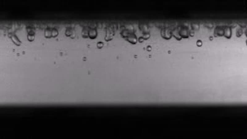 This black and white video shows liquid flowing from left to right through a rectangular channel. At the beginning of the video, as the liquid begins to boil, small bubbles flow from the heated side of the channel (which, in this video, appears to be the “top” of the channel). Over time, larger and larger bubbles form, filling the width of the channel as they flow.