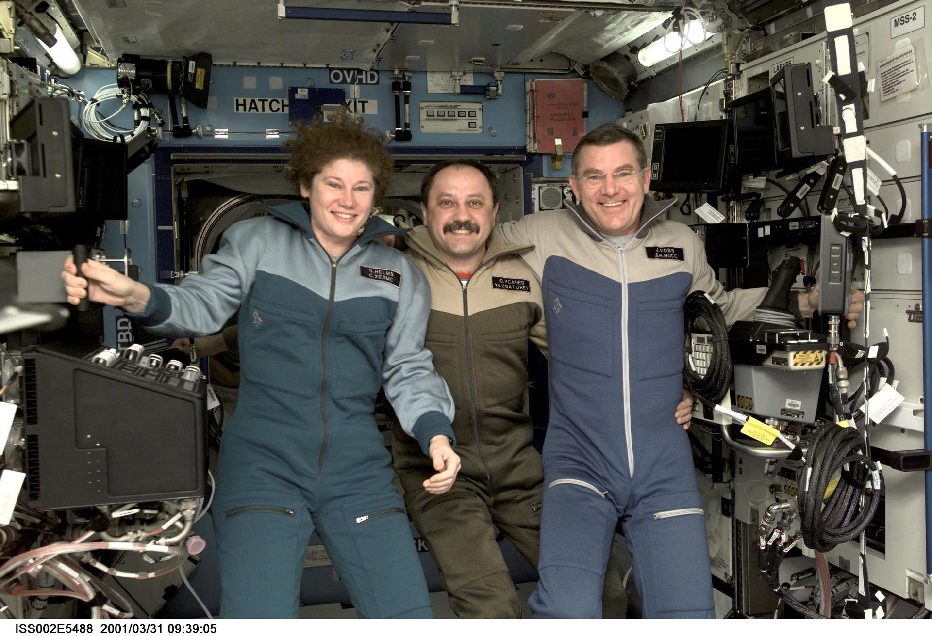ISS002-E-5488 (31 March 2001) --- The Expedition Two crewmembers -- astronaut Susan J. Helms (left), cosmonaut Yury V. Usachev and astronaut James S. Voss -- pose for a photograph in the U.S. Laboratory / Destiny module of the International Space Station (ISS). This image was recorded with a digital still camera.