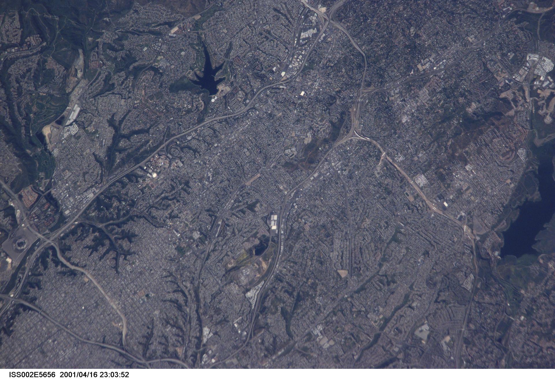 ISS002-E-5656 (16 April 2001) --- Extreme southern topography of California, including inland portions of the San Diego area were captured in this digital still camera's image from the International Space Station's Expedition Two crew members. The previous frame (5655) and this one were both recorded with an 800mm lens, whereas the succeeding frame (5657) was shot with a 105mm lens.