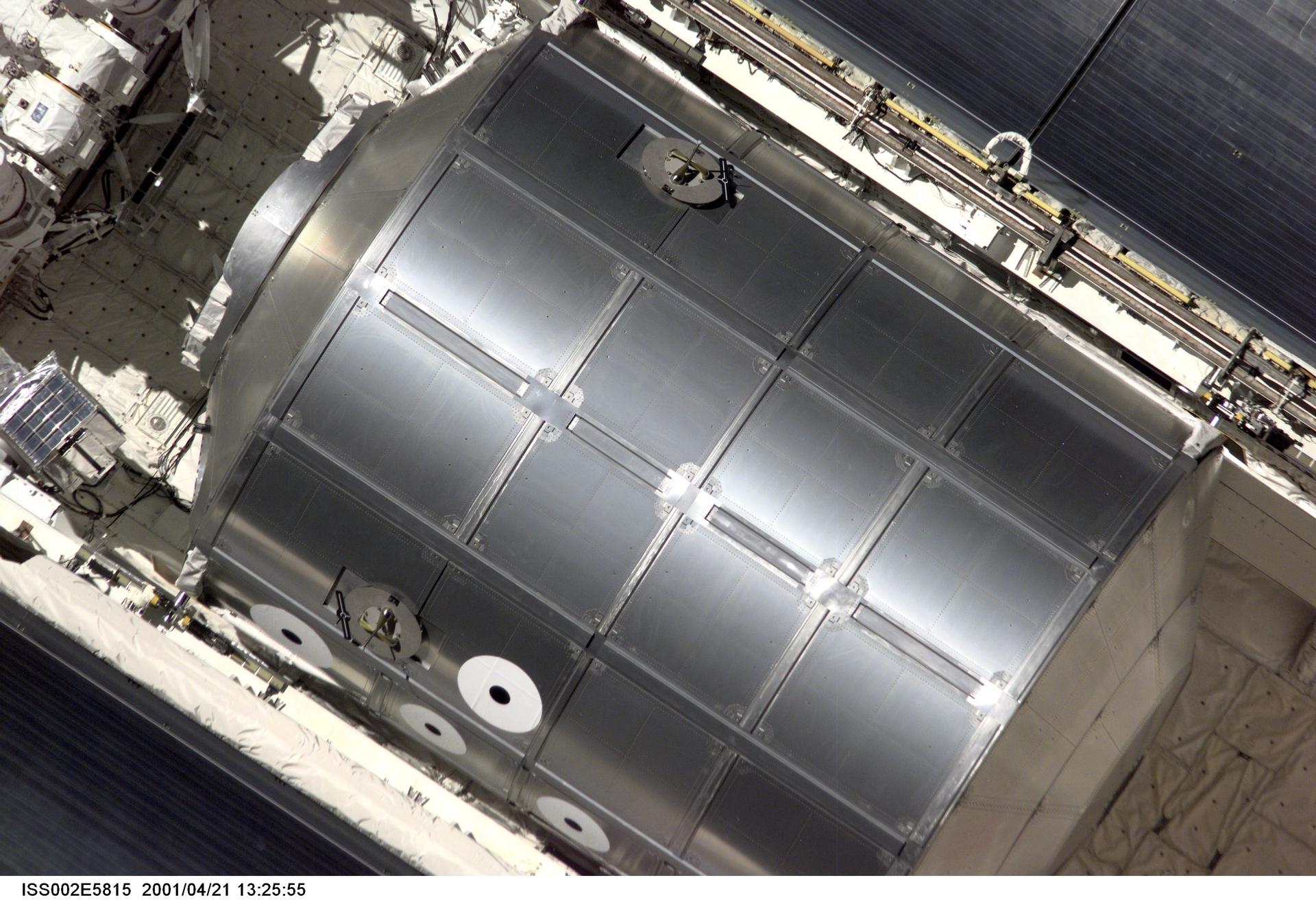 ISS002-E-5815 (21 April 2001) --- The Raffaello Multi-Purpose Logistics Module (MPLM), built by the Italian Space Agency (ASI), sits in its berthed position in the cargo bay of the Space Shuttle Endeavour as the STS-100 crew eases the vehicle close to the International Space Station (ISS) for docking. The image was recorded with a digital still camera by one of the Expedition Two crew members aboard the Station.