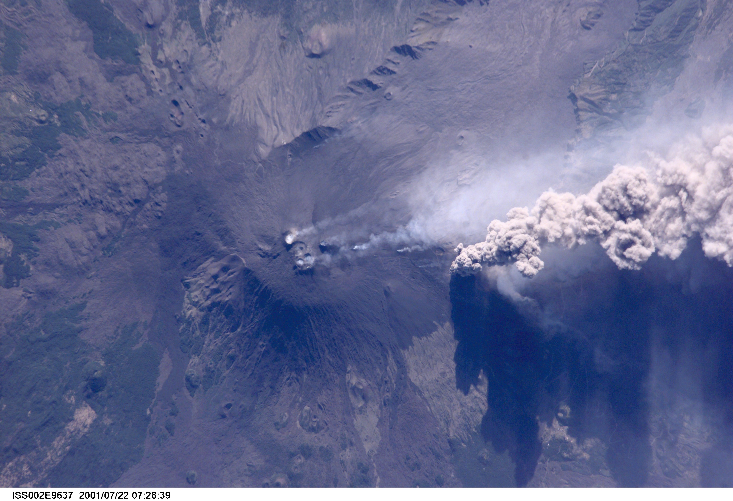 ISS002-E-9637 (22 July 2001) --- An overhead look at the smoke and ash being expelled from the erupting volcano Mt. Etna on the island of Sicily. This image was recorded by an Expedition Two crew member with a digital still camera.