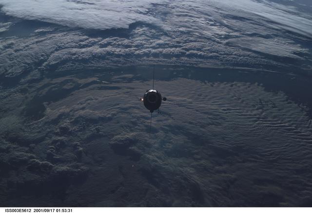 ISS003-E-5612 (17 September 2001) --- The Russian docking compartment Pirs approaches the International Space Station (ISS). The Pirs will provide a docking port for future Russian spacecraft as well as an airlock for extravehicular activities (EVA).