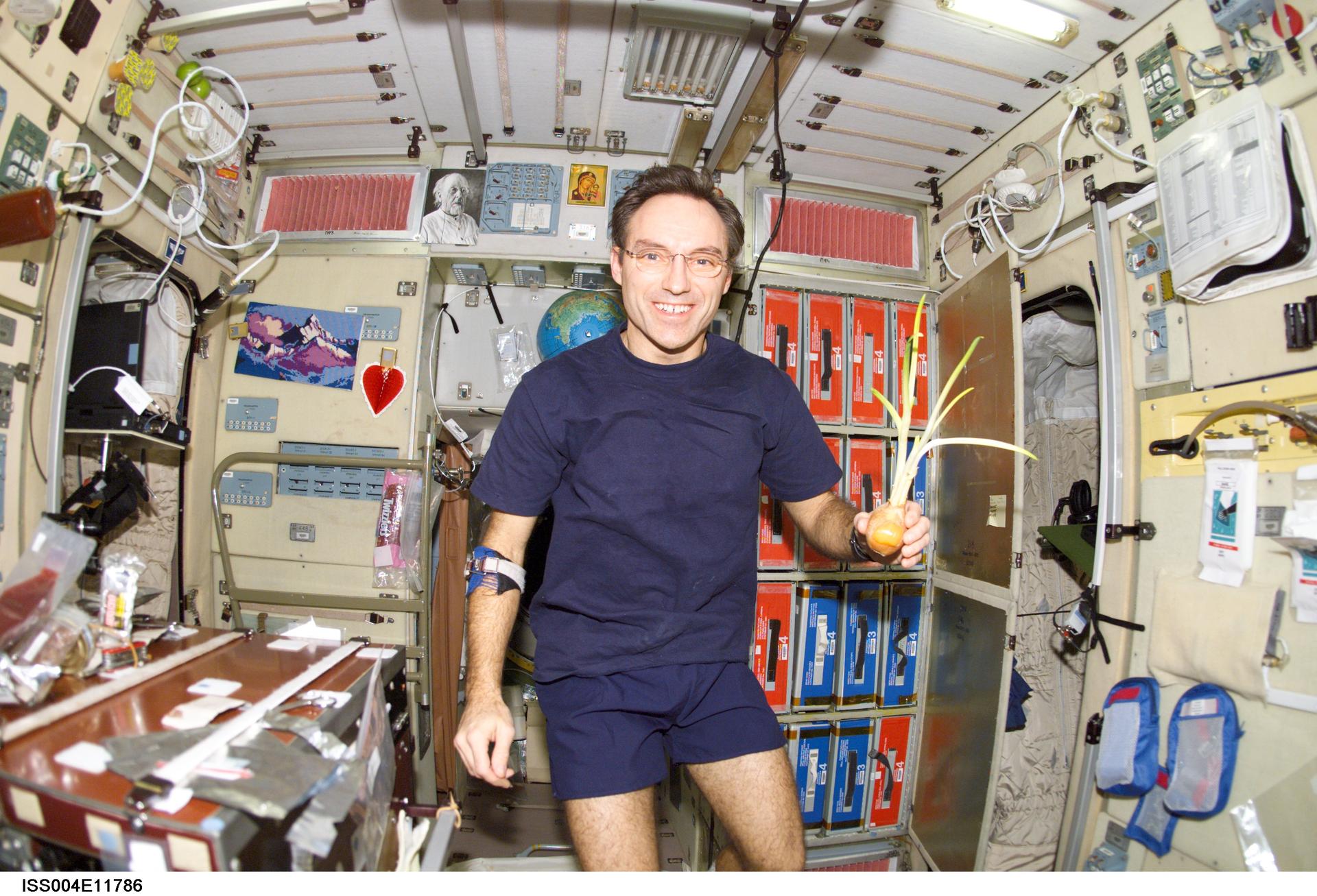 ISS004-E-11786 (24 April 2002) --- Astronaut Carl E. Walz, Expedition Four flight engineer, holds a plant in the Zvezda Service Module on the International Space Station (ISS).