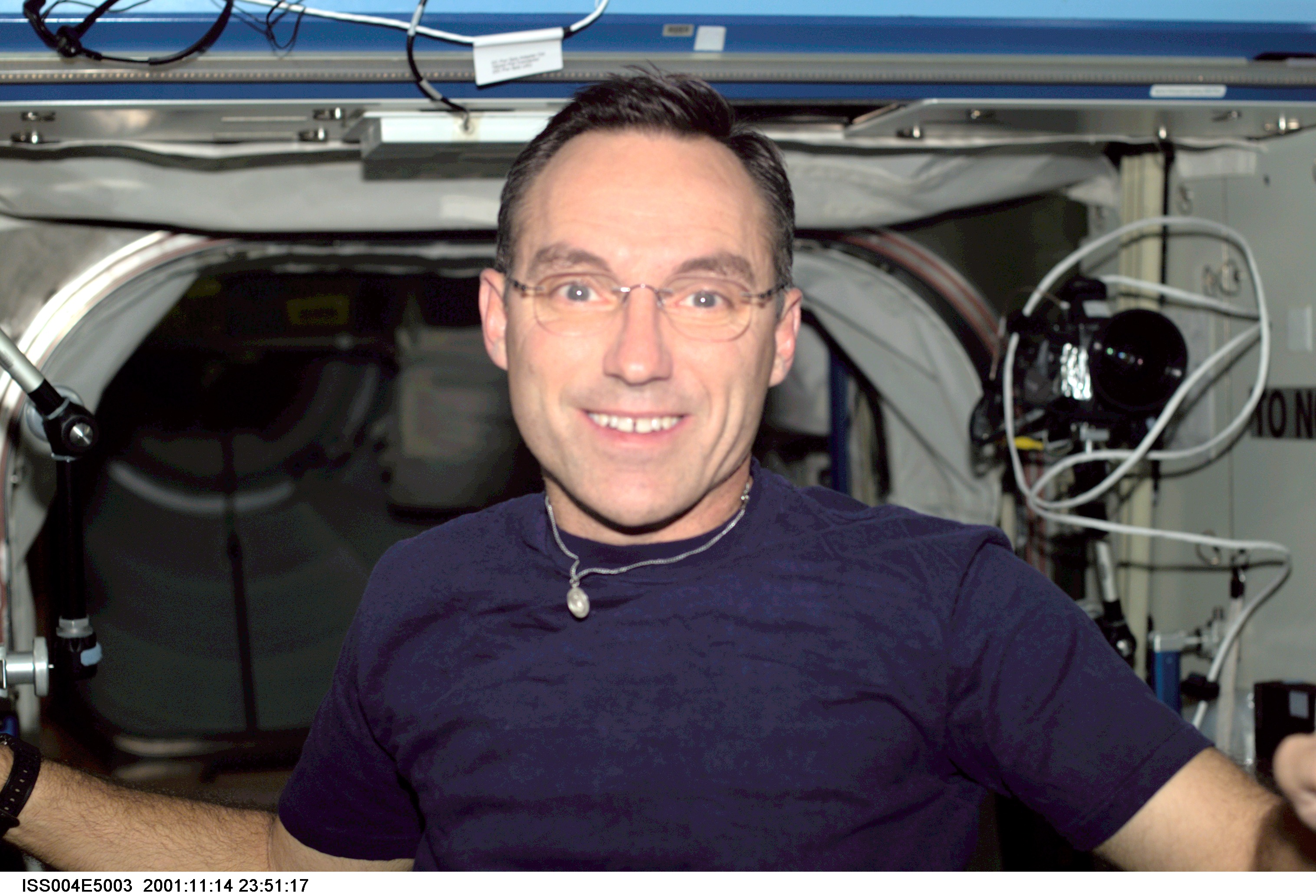 ISS004-E-5003 (December 2001) --- Astronaut Carl E. Walz, Expedition Four flight engineer, is photographed in the Destiny laboratory on the International Space Station (ISS). The image was taken with a digital still camera.
