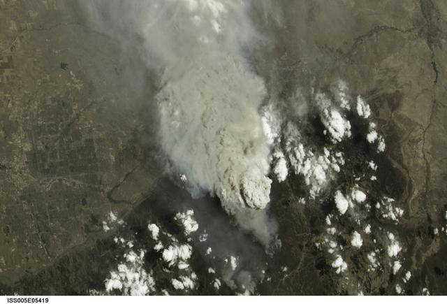 ISS005-E-5419 (18 June 2002) --- This photograph, taken by the International Space Station’s Expedition Five crew on June 18, 2002, shows the Hayman Fire burning in the foothills southwest of Denver. Astronauts use a variety of lenses and look angles as their orbits pass over wildfires to document the long-distance movements of smoke from the fires as well as details of the burning areas. In this perspective view, Littleton, Chatfield Lake and the Arkansas River are all visible. The link [<http://eol.jsc.nasa.gov/scripts/sseop/photo.pl?mission=ISS005&roll=E&frame=5416> ] was provided by the Earth Sciences and Image Analysis Laboratory at Johnson Space Center. Additional images taken by astronauts and cosmonauts can be viewed at the NASA-JSC Gateway to Astronaut Photography of Earth [link to <http://eol.jsc.nasa.gov/> ].