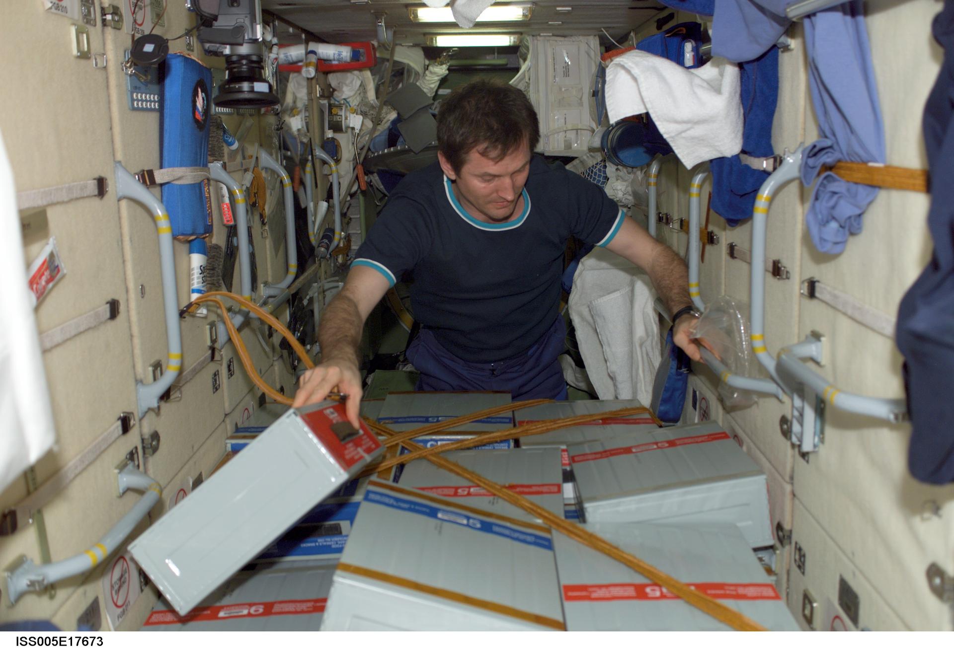 ISS005-E-17673 (17 October 2002) --- Cosmonaut Sergei Y. Treschev, Expedition Five flight engineer representing Rosaviakosmos, checks stowage boxes in the functional cargo block (FGB), or Zarya, on the International Space Station (ISS).