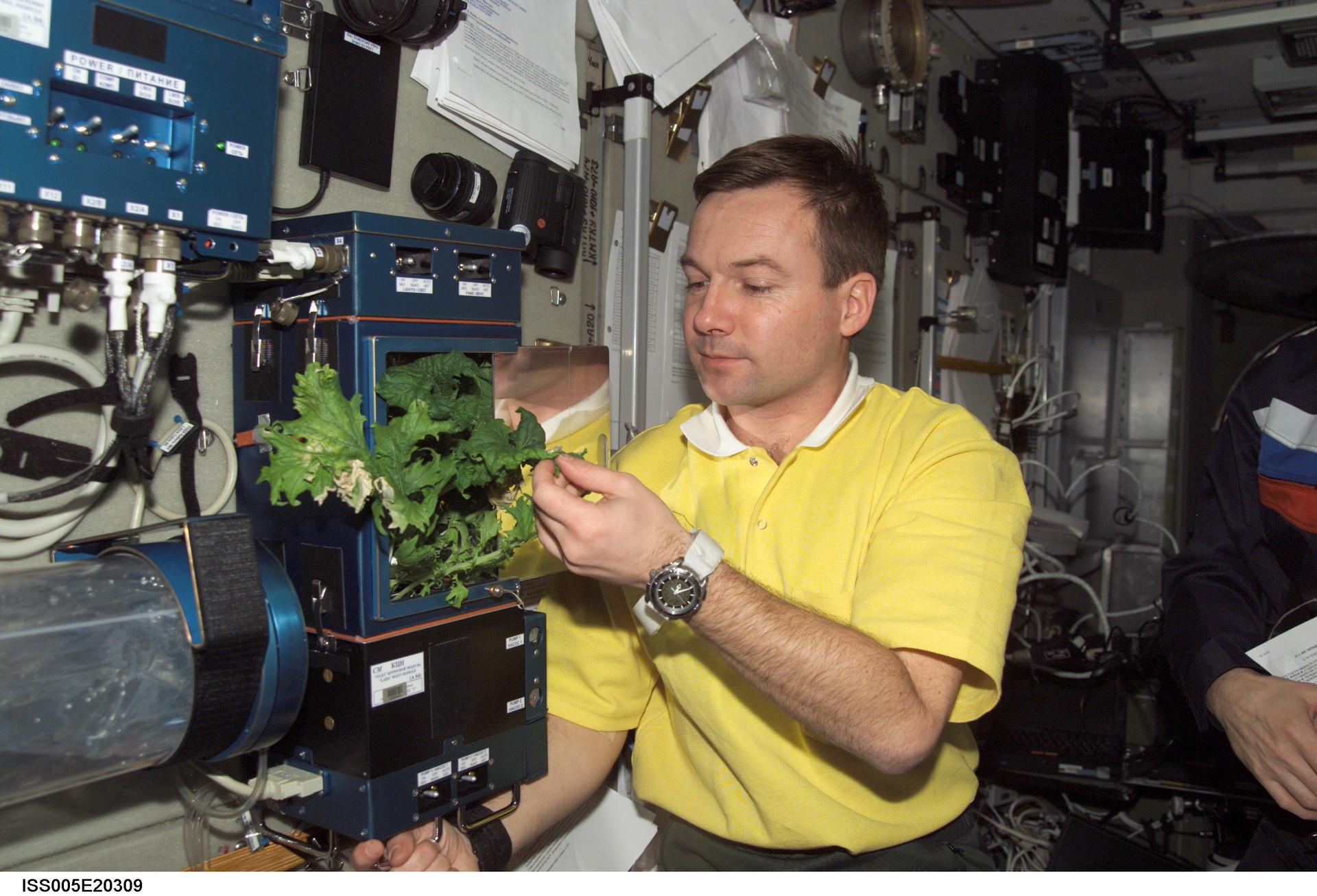 ISS005-E-20309 (8 November 2002) --- Soyuz 5 Flight Engineer Yuri V. Lonchakov looks at a plant growth experiment in the Zvezda Service Module on the International Space Station (ISS). Lonchakov represents Rosaviakosmos.
