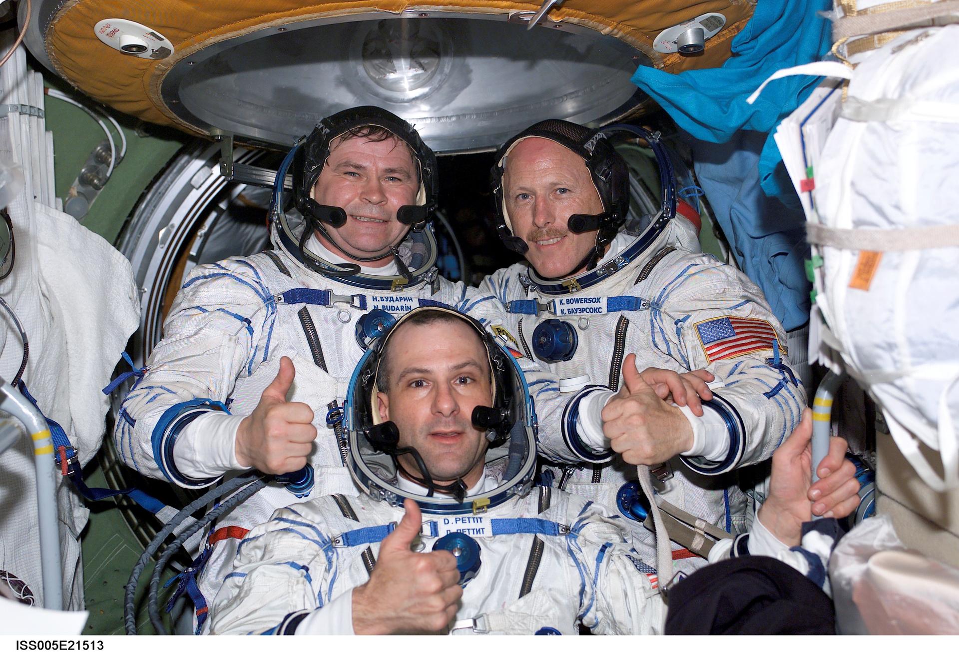 ISS005-E-21513 (26 November 2002) --- The Expedition Six crewmembers, wearing Russian Sokol suits, pose for a crew photo in the functional cargo block (FGB), or Zarya, on the International Space Station (ISS). Pictured are astronaut Donald R. Pettit (front), NASA ISS science officer; cosmonaut Nikolai M. Budarin (left back), flight engineer; and astronaut Kenneth D. Bowersox, mission commander. Budarin represents Rosaviakosmos.