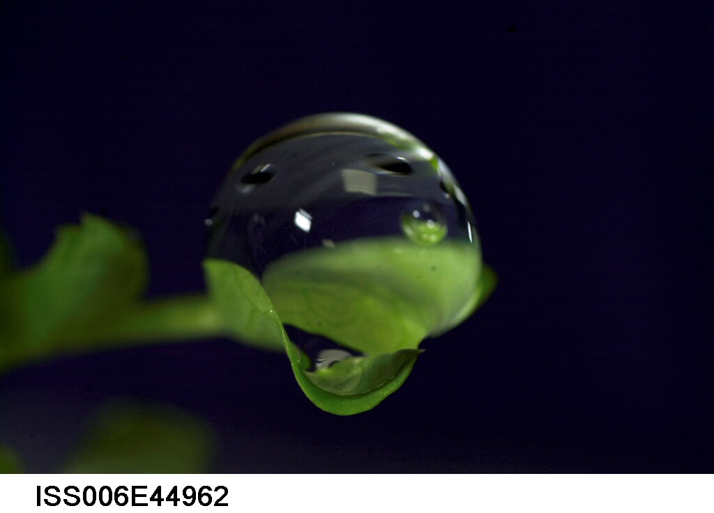 ISS006-E-44962 (9 March 2003) --- A close up view of a water droplet on a leaf on the Russian BIO-5 Rasteniya-2/Lada-2 (Plants-2) plant growth experiment, which is located in the Zvezda Service Module on the International Space Station (ISS).